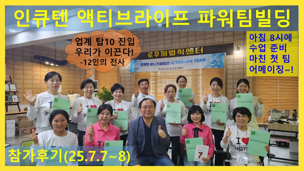 월,화요일엔 인큐텐 첫 파워팀빌딩도 진행했다. 15년전 강의 인연을 잊지 않고 이렇게 찾아오다니... 모두 회사를 업계 탑10으로 진입시키는 전사가 되겠다는 다짐들을 하고 돌아간다. 그들의 눈빛에서 눈부신 도약이 기대되고, 또 응원한다.