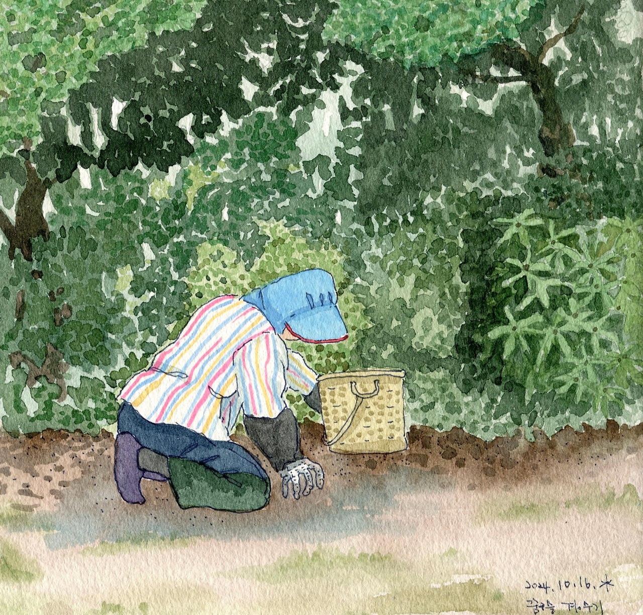 ”그렇지. 이거 주워서 씻어서 바짝 말렸다가 기름을 짜야하는데 어제 짜려고 가보니 아직 좀 있다가 오라고 하더라고 “
