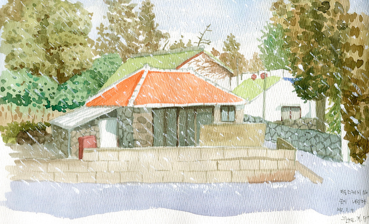 #눈 내리는 풍경#눈 오는 제주#눈#제주마을#제주동네#마을스케치#동네드로잉#서귀포마을#수채화그림#붓드로잉#눈 오는 날