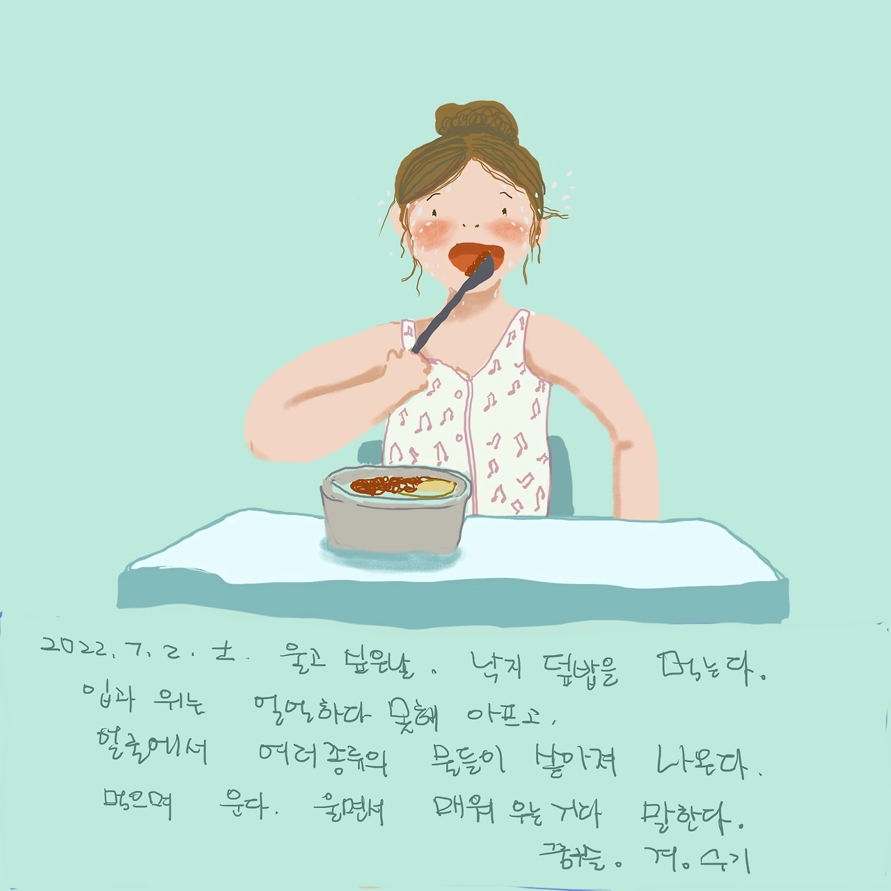 온 얼굴은 땀과 눈물과 콧물 범벅.