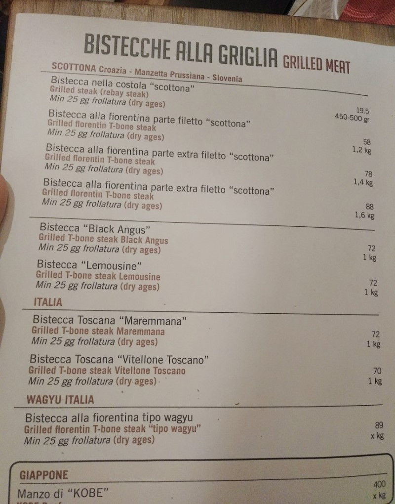이탈리아어로 '비스테카 알라 피오렌티나(Bistecca alla piorentina)' 즉 피렌체식으로 구운 스테이크라는 뜻이다.
