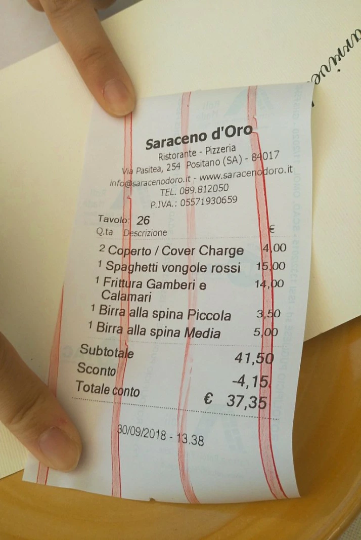 역시 남부 이탈리아에선 해산물 요리를 잘하는구나 싶다. 10프로 할인을 받았는데도 40유로 가까이 나왔다.