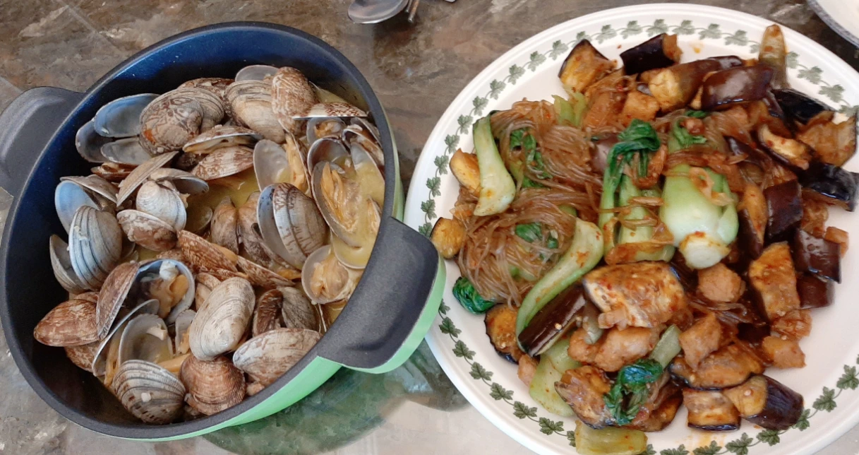 올리브 오일과 마늘 베이스인 봉골레와 파기름을 낸 중국풍 항정살 가지볶음이 오늘의 메인 안주이다.