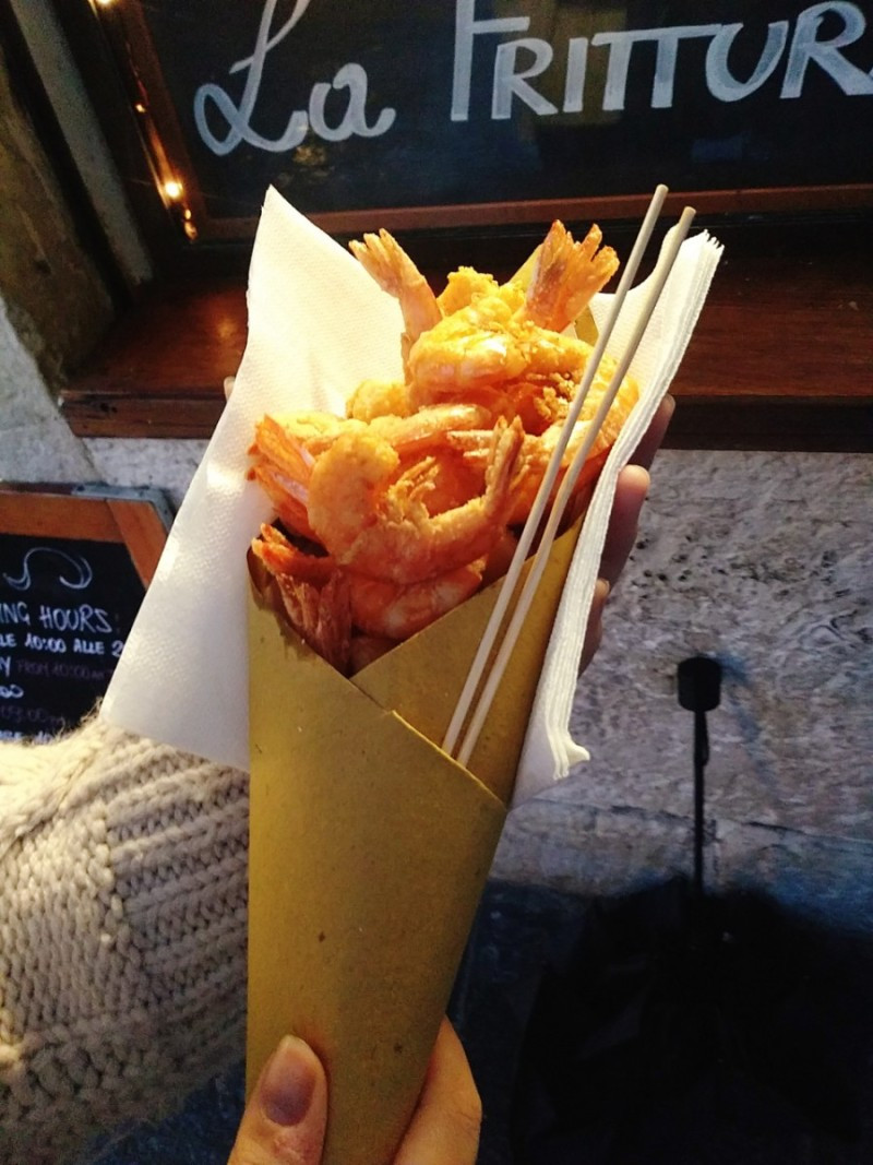 오후 일정은 없어졌지만 그래도 베네치아의 첫 날을 그냥 보낼 수는 없었다. 비 오는 거리를 헤치고 튀김 맛집으로 소문난 프리토 인 (Frito Inn)을 찾아갔다. 역에서 민박집 가는 도중에 있는데 들어가서 먹을 수 있는 곳은 아니고 테이크 아웃해서 가져가서 먹어야 했다. 한국 여행객이 많아서 그런지 메뉴판도 한글로 적혀 있었다.