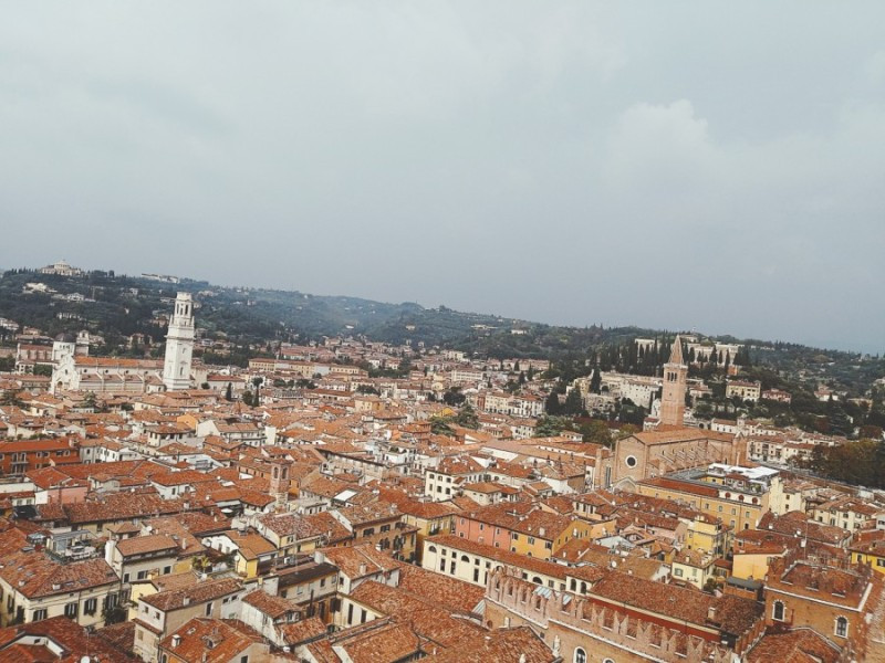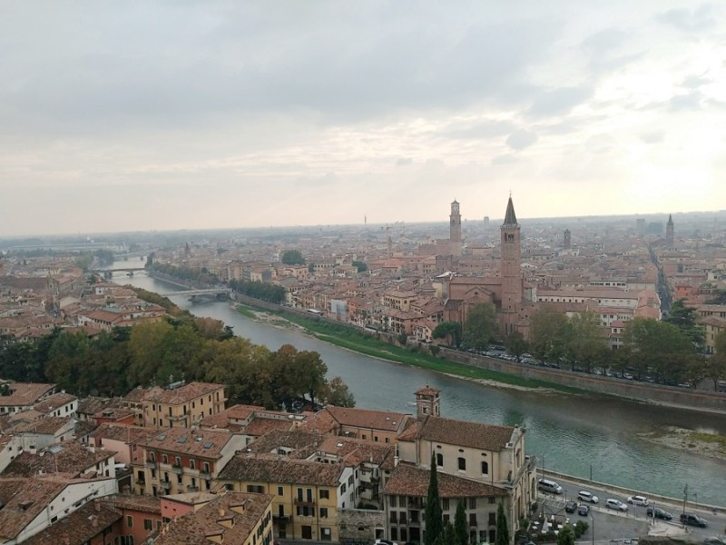 가장 높은 곳이라 그런지 과연 도시 전체를 360도 다 둘러볼 수 있었다. 심지어 멀리 산 피에트로 성도 아래로 보인다. 이전의 여행에서는 왜 입장료를 내가며 전망대에 오르는지 이해를 하지 못했었다. 하지만 이번 여행에서는 도시마다 전망대에 올라 도심을 보았다. 딸이 좋아해서 같이 오르기도 하지만 도심의 모습을 위에서 보는 것은 예전에는 생각지도 못했던 새로운 감동을 안겨준다. 언뜻 보면 유럽 도시가 다 비슷한 것 같다. 그렇지만 다시 보면 나름 도시마다 자기 나름의 개성이 있다. 베로나의 구시가지는 그리 넓지 않고 아기자기하면서 정감이 넘친다. 도시의 모습을 보다 보니 밀라노 가는 중간에 있는 도시인데 당일치기 말고 1박이라도 할걸... 하는 아쉬움이 들었다.