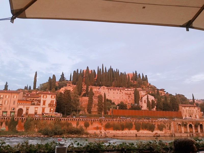 가게 안으로 들어서면 어두운 보통의 카페 같은 공간이 있지만 안쪽의 문을 나서면 마법처럼 테라스가 나타난다. 테라스의 테이블에 앉으면 아디제 강과 반대편 산 피에트로 성이 눈 앞에 펼쳐져 있었다. 안주도 없이 맥주 두 잔 시켜 놓고 하염없이 강을 바라보았다. 노을빛이 그림처럼 나지막한 산을 물들여가고 있었다. 나에게는 너무나도 좋았던 기억으로 남아있어서 얼마 전 딸에게도 물어보았다. "그때 베로나에서 갔던 카페 너무 좋지 않았어?" "아아... 엄마가 나랑 같이 가서는 계속 아빠랑 왔으면 좋겠다고 했던 곳?" 시크하게 대답했다. 앗! 내가 그랬던가?... 미안.