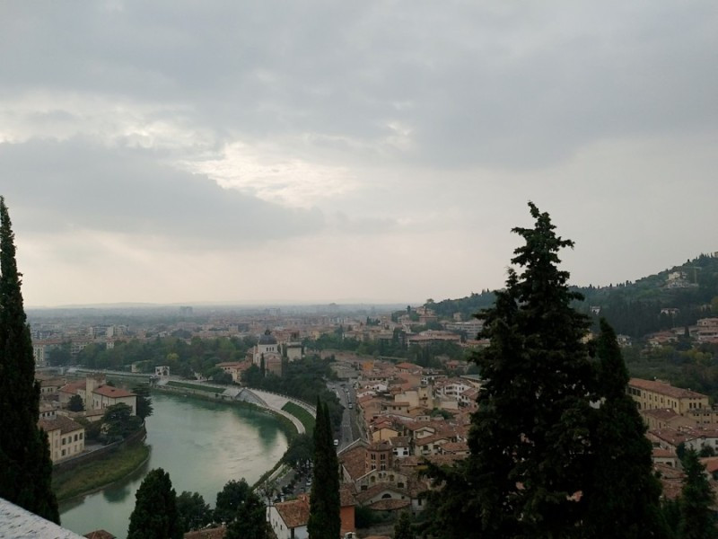 오르막을 힘들어하는 딸을 위한 배려이자 시간을 아끼기 위함이었다. 맑았지만 구름이 좀 있어서 그리 덥지도 춥지도 않은 완벽한 날씨라 멀리까지 바라보이는 풍경이 정말 멋졌다. 대부분 성 안으로는 들어가지 않고 광장에서 도심을 향해 전망을 보기 위해 올라간다. 우리도 역시 성 밖의 광장에서 베로나의 구시가지 쪽 전망을 감상했다.