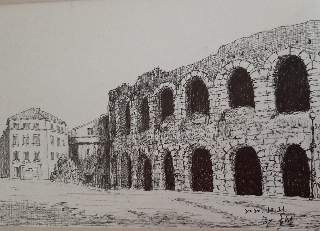 사진 속 아레나 외부의 파손된 거친 벽돌을 그리다 문득 이런 생각이 들었다. 2천 년이 넘는 세월을 버티며 역사의 흥망성쇠를 지켜본 이 건축물은 어쩌면 이 또한 시간이 지나면 찰나에 불과하다고 말해주고 있는 게 아닐까하고...