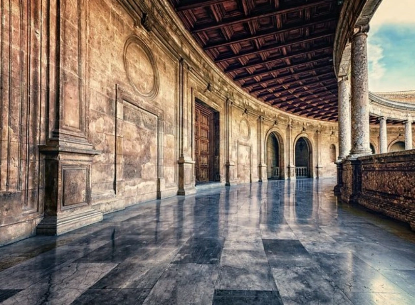알람브라 궁전의 분위기에 어울리지 않는다고 혹평을 받기도 한다지만 막상 들어가 보니 고전적인 르네상스 양식의 건물이 아름답게 느껴졌다. 둥글게 이루어진 중정 주위로 2층의 회랑이 둘러싸고 있고 1층은 도리아식, 2층은 이오니아식 기둥이 건축되어 있다.
