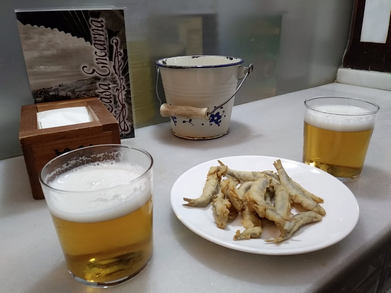 문을 연지 얼마 안 돼서 우리밖에 없을 줄 알았는데 벌써 손님이 한 팀 있었다. 맥주를 두 잔 주문하니 멸치보다 약간 큰 생선 튀김이 나왔다. 금방 튀겨서 뜨겁고 얇은 튀김옷이 바삭한 식감을 주고 짭조름한 맛에 맥주 안주로 딱이다. 가지고 간 튜브 고추장에 찍어 먹으니 맛이 일품이었다. 다음에 무슨 타파스가 나올지 몹시 궁금하지만 이제 곧 마지막 타파스 바가 문을 열 시간이다. 친절하고 맛있어서 다음 기회가 있다면 다시 오고 싶은 타파스 바였다.