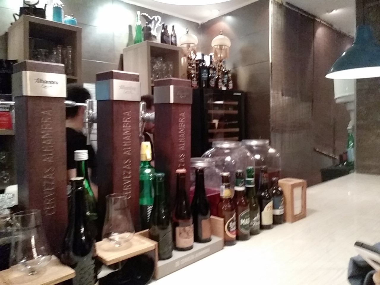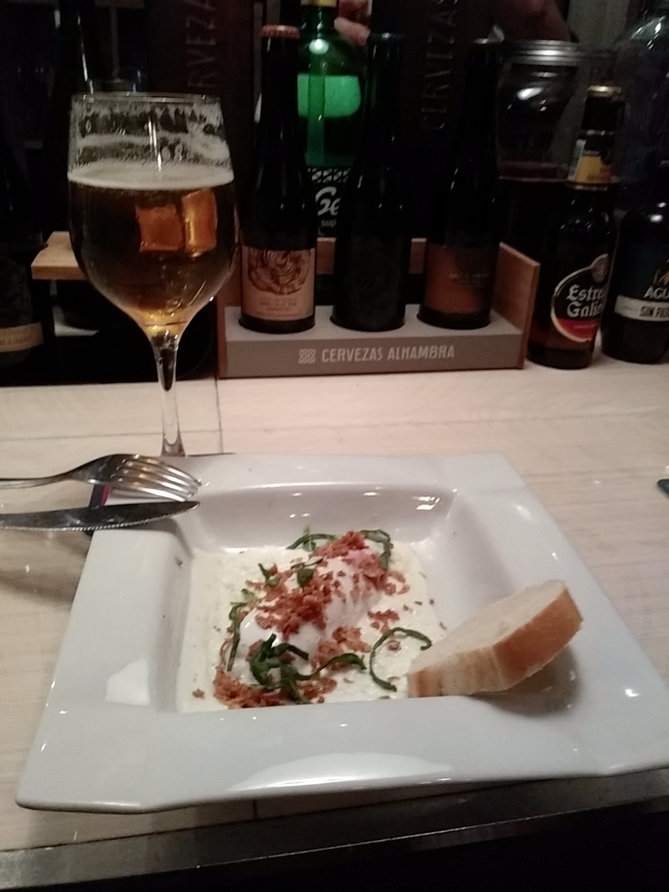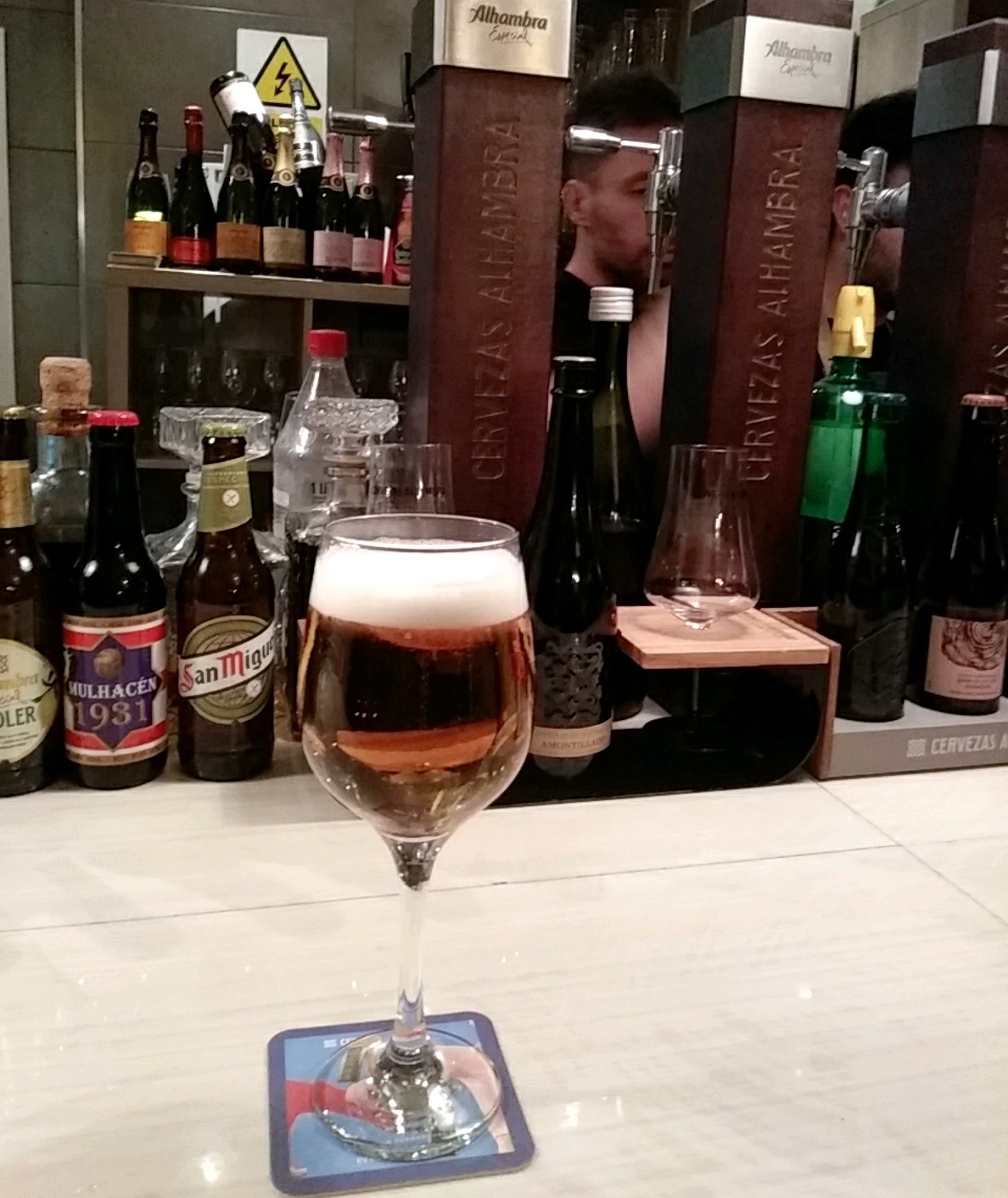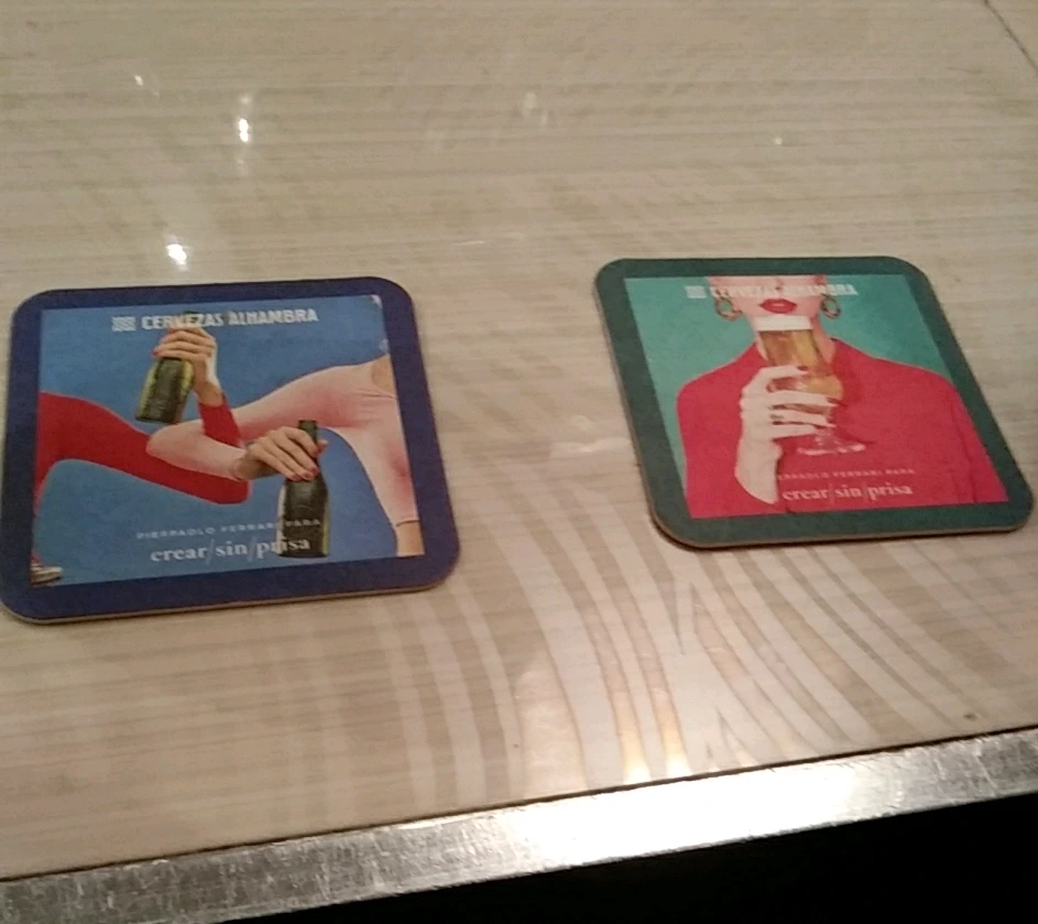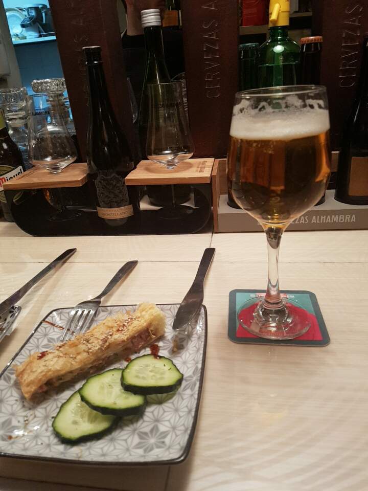 맥주 두 잔을 주문하니 센스 있게 아방가르드한 디자인의 컵 코스트를 깔아주었다. 색이 진하고 맛도 진한 알람브라 생맥주가 서빙되었다. 스페인에 와서 먹어 본 맥주 중에 알람브라 맥주가 가장 맛이 있는 것 같다.