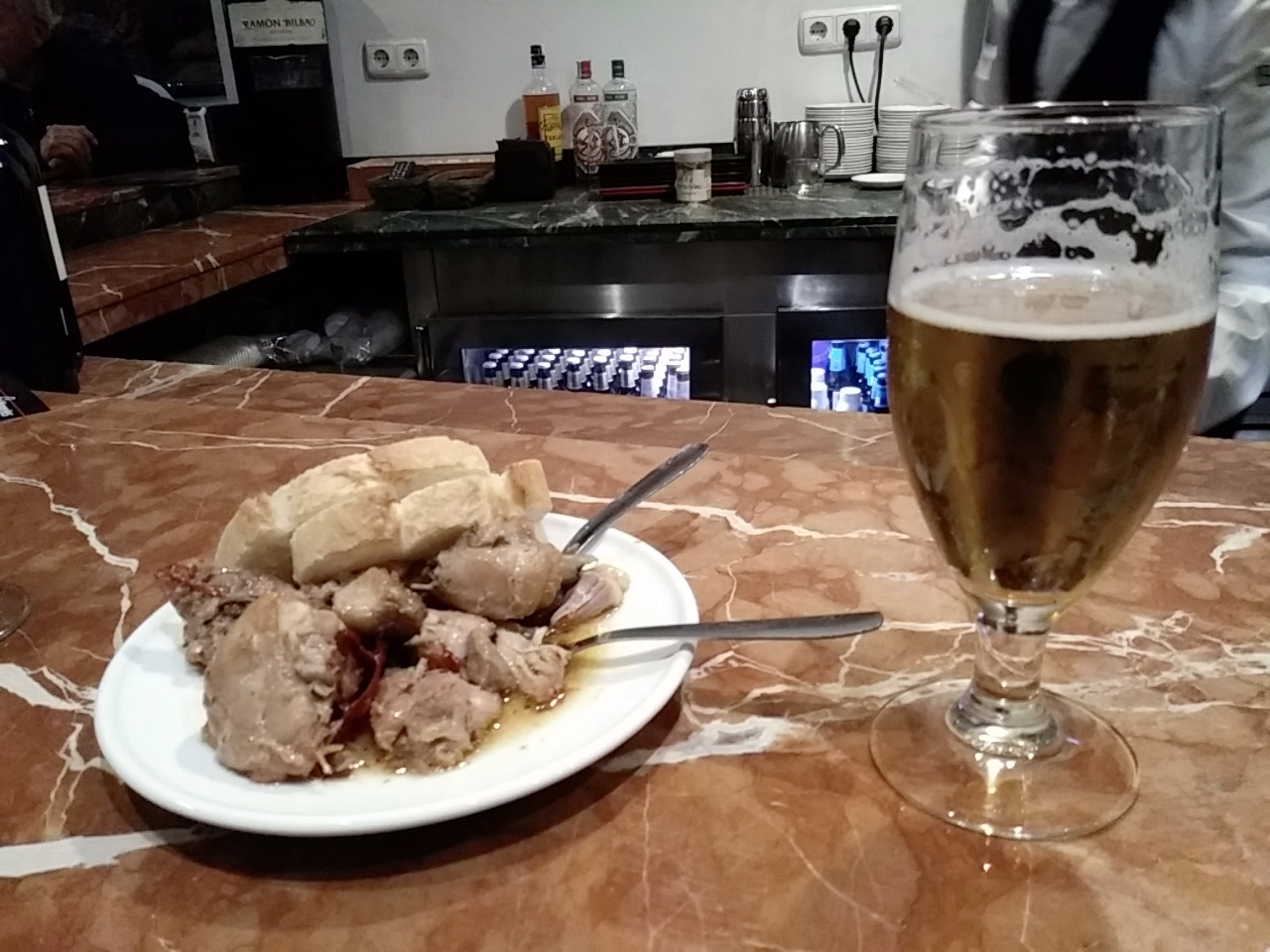맥주 두 잔과 함께 짭짤한 닭찜 비슷한 타파스가 따라 나왔다. 맥주 맛도 좋았고 타파스도 푸짐하고 맛있었지만 너무 바빠서 정신이 없는지 직원을 부르기도 힘들고 추가 주문도 어려워서 그냥 나와야 했다. 다음에는 어떤 타파스가 나올지 궁금했지만 어쩔 수 없었다. 맥주 두 잔에 4.9 유로 (약 6,400원), 중심가라 다른 곳보다 좀 비싼 것 같다.