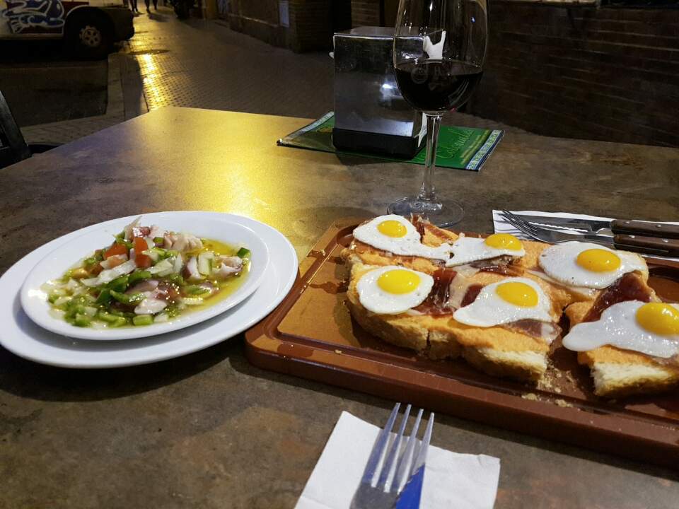 이 레스토랑의 인기 메뉴인 문어 샐러드와 이름이 뭔지는 모르지만 식빵에 하몽과 메추리알을 올린 음식을 와인 두 잔과 함께 주문했다. 문어 샐러드는 역시나 (전에 먹어본 것과는 조금 달랐지만) 맛이 있었다. 부드럽게 익힌 문어를 작게 썰어서 아삭한 채소와 올리브유, 식초 등이 들어가 새콤하고 싱싱한 맛이 너무 좋다. 그리고 같이 나온 하몽 요리는 뭐라고 해야 할지... 한 번도 먹어보지 못한 소스의 맛이 포인트였는데 와인과 함께 먹으니 정말 기가 막힌다.