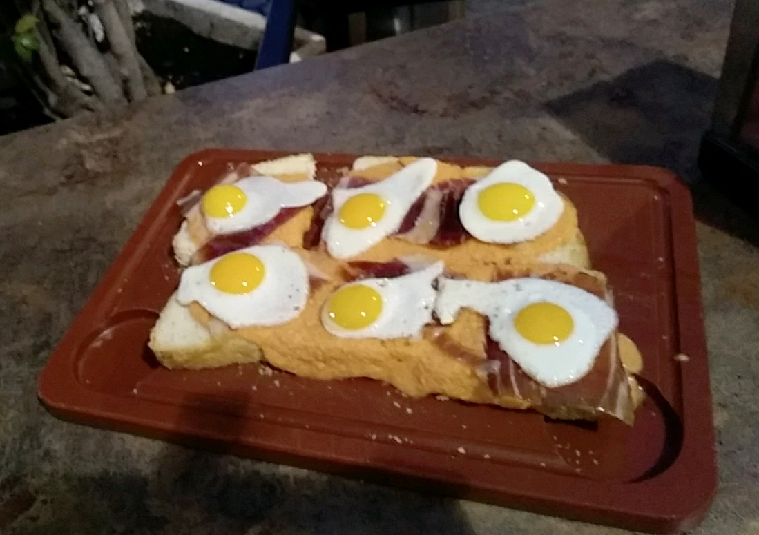 식빵에 하몽과 메추리알을 얹은 음식
