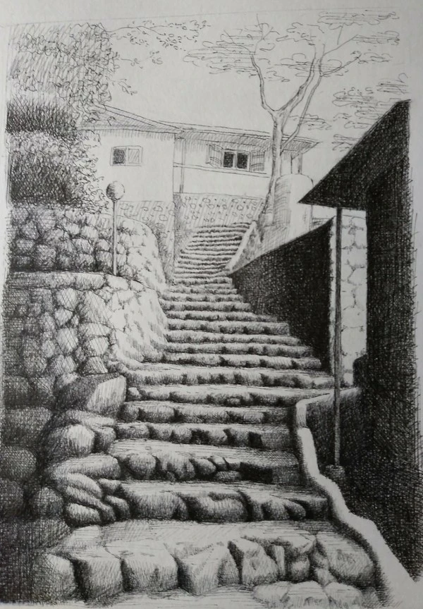 아! 이렇게 그림을 그림을 그리기 시작했었지. 뭔가 신기한 기분이 들었다. 2017년어느 날 구청 문화센터에서 매주 화요일 오전 10시에 기초 소묘와 펜화 수업이 개설되었다. 남편에게 수업을 들어보고 싶다고 얘기하니 흔쾌히 그러라고 했다. 스케치북과 4B연필, 지우개 등 학교 졸업 후 처음으로 아이들 것이 아닌 내가 쓸 미술 용품을 장만하며 설렜다. 첫 수업 시간에 낯설고 두려워 뻘쭘하게 강의실에 들어섰던 것, 선 긋기며 명암, 패턴 등을 배웠던 기억이 새삼 떠오른다. 구도나 원근법도 잘 몰라서 하나하나 새로이 배우는 것이 모두 재미있었다.