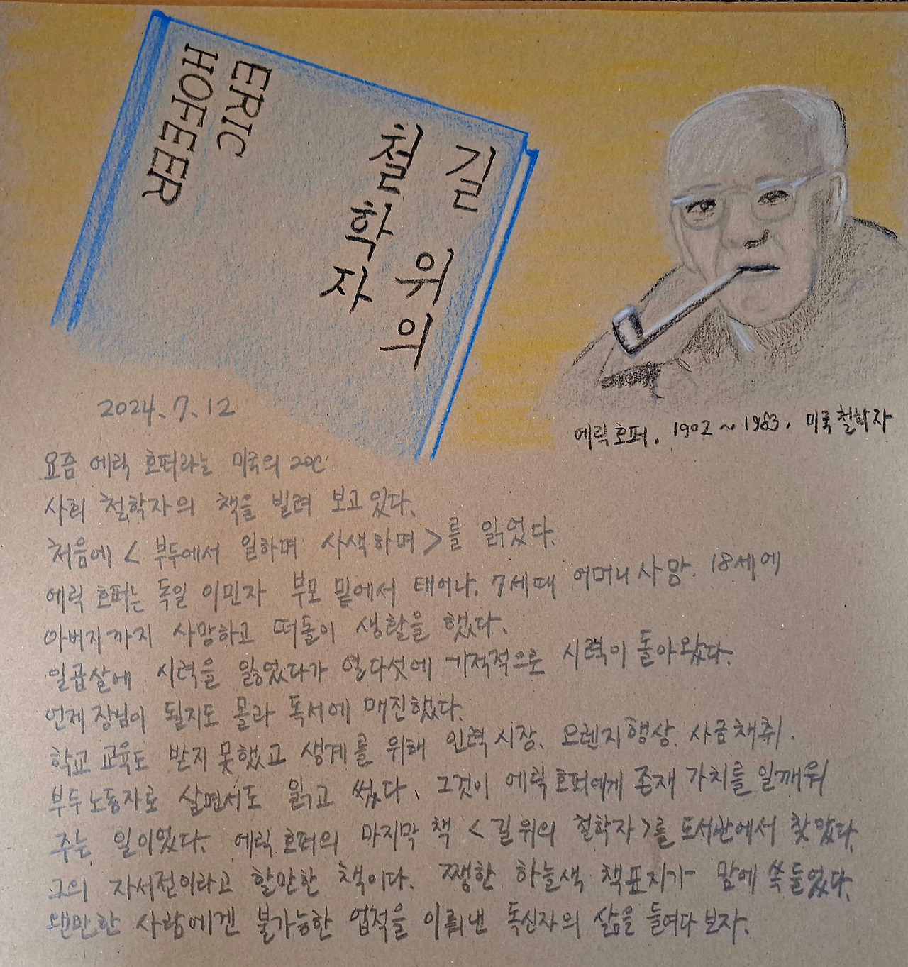 이 작가는 부모 복 없이 불행하게 성장했고, 평생 독신이었고, 떠돌이 노동자로 살면서, 독학으로 독서와 글쓰기를 멈추지 않았고, U.C 버클리 대학에서 강의를 했고, 미국 대통령 자유훈장을 받았고, 11권의 책을 출간했고, 사후 2001년 <에릭호퍼 문학상>이 제정되었다.