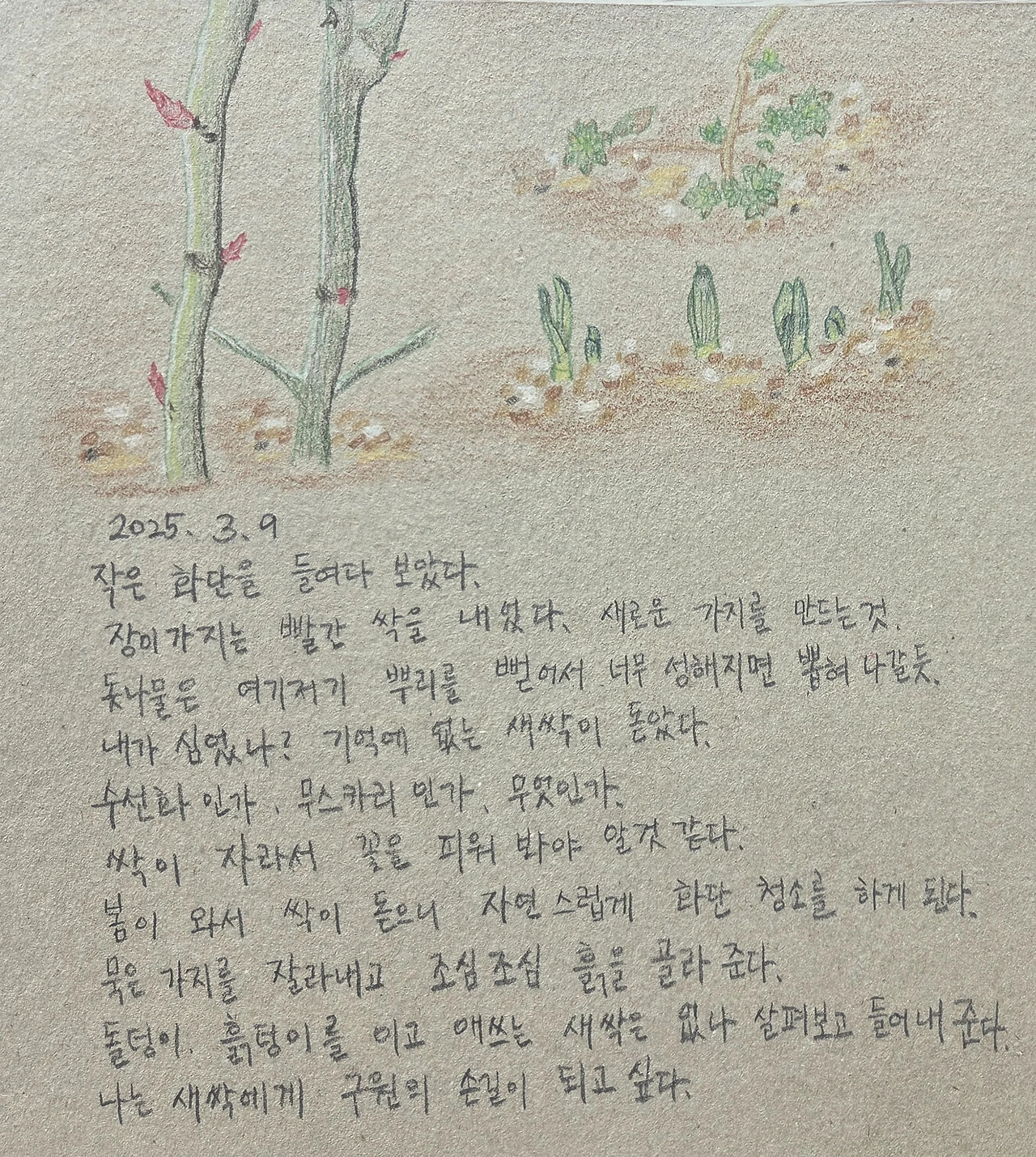 빨간 싹이 점점 자라나서 녹색 줄기가 되고 5월이면 그 끝에 환타색 장미꽃이 피겠지.