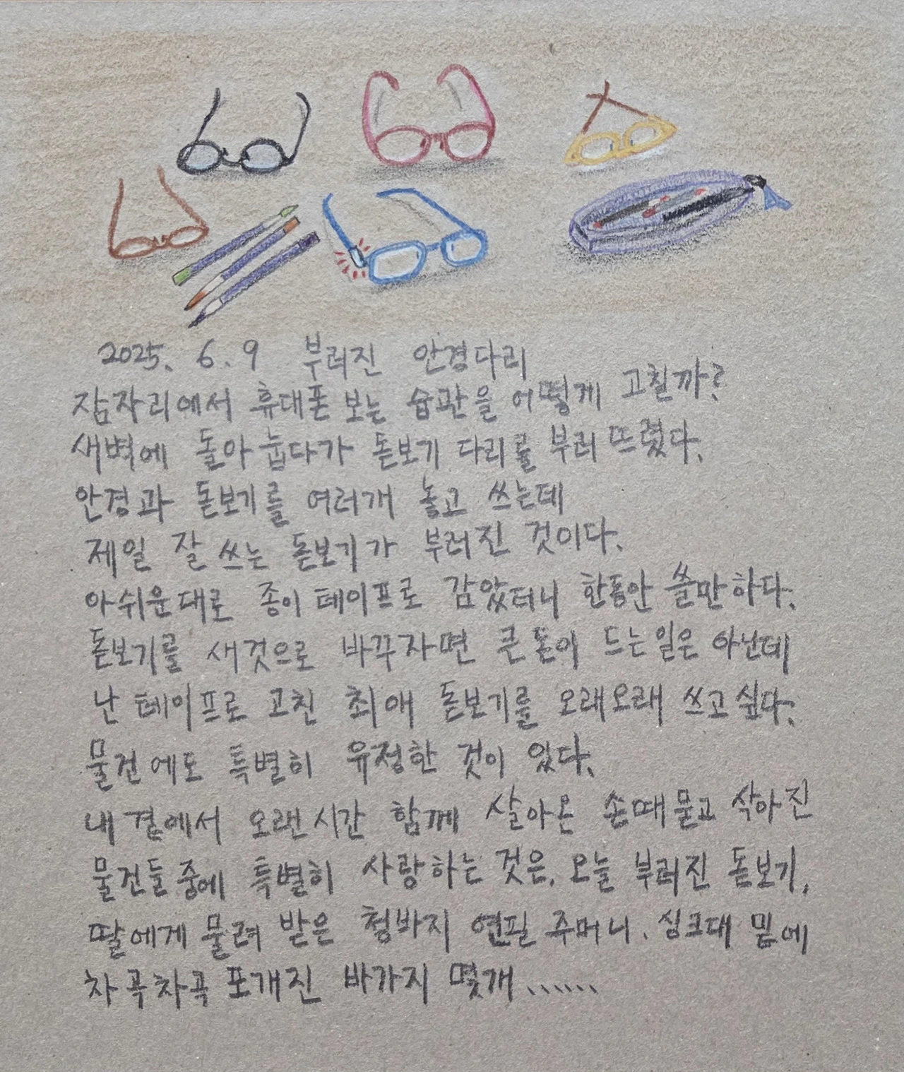 돋보기를 새로 바꾸는데 큰돈이 드는 것도 아닌데, 테이프로 수선이 된 것에 이렇게 감사해서 그림일기까지 쓰다니 정든 것 맞지.