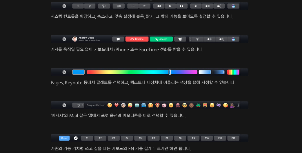 그럼 터치바는 어떻게 사용자들에게 스마트폰의 경험을 가져다줄 수 있을까요? 터치바가 기존의 펑션키 자리에 들어가다 보니 멀티터치=진화된 펑션키라는 공식으로 생각이 됩니다. 하지만 이 프레임은 터치바를 어떻게 더 활용할 수 있는지를 상상하는데 장애물로 작용합니다. 기존의 펑션키는 고정된 위치에 고정된 키배열과 각 키에 할당된 고정된 기능이 있었습니다. 하지만 이 자리에 새로 들어온 터치바는 제한된 공간이지만 그 공간 안에서는 어떠한 가젯도 표현해낼 수 있고 사용자는 그 가젯을 직접 손으로 만질 수 있습니다.