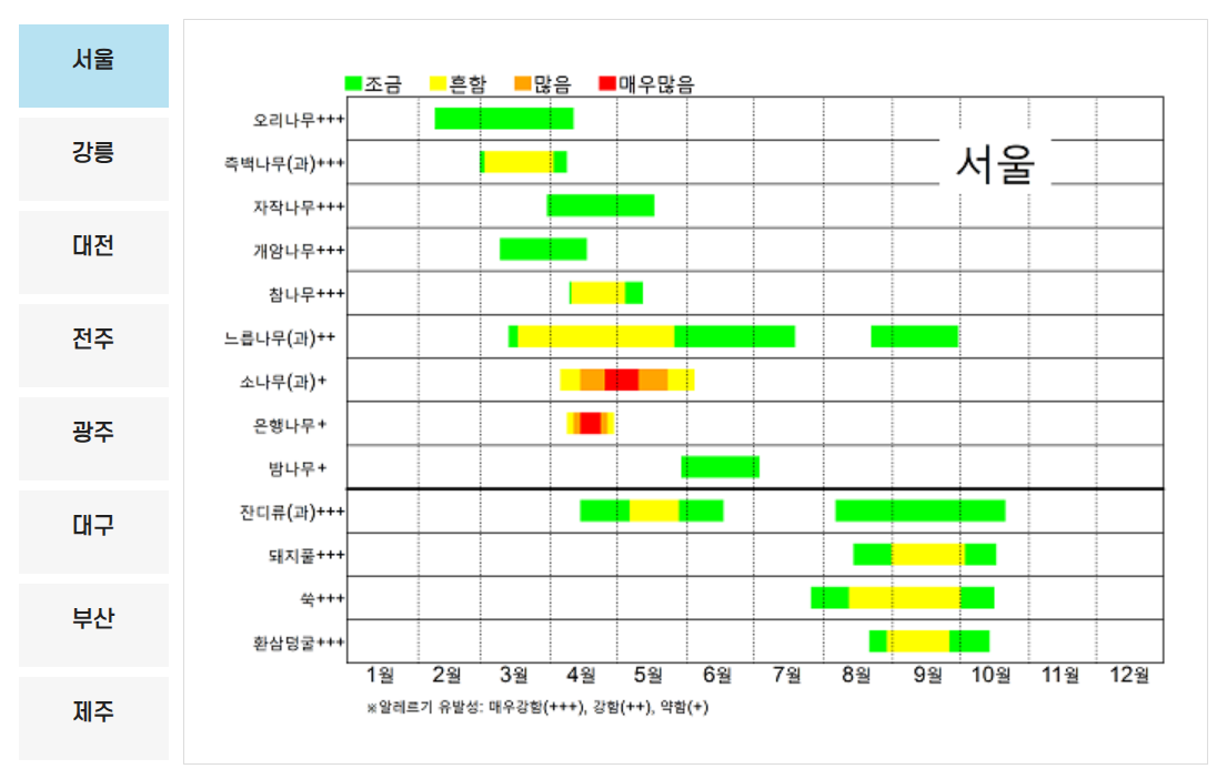 한 가지 재밌는 점은 소나무가 주요 원인이 아니라는 것입니다. 본인이 소나무에서 나오는 송홧가루에 심하게 반응한다고 알고 계신 분이 많지만 사실 송홧가루는 입자가 크고 알레르기 항원성이 낮아 물리적으로는 상기도에서 쉽게 걸러지고 화학적으로는 다른 꽃가루에 비해 반응을 크게 일으키지 않습니다. 누가 봐도 알레르기의 주범이라고 생각할만한 노랗고 연두색인 그 가루에 다들 속으신 겁니다. 색깔만 보면 생화학 무기 수준이지만 알레르기의 주범은 아닙니다. 같은 시기에 날리는, 우리 눈에 잘 보이지 않는 다른 꽃가루들이 훨씬 문제가 됩니다.