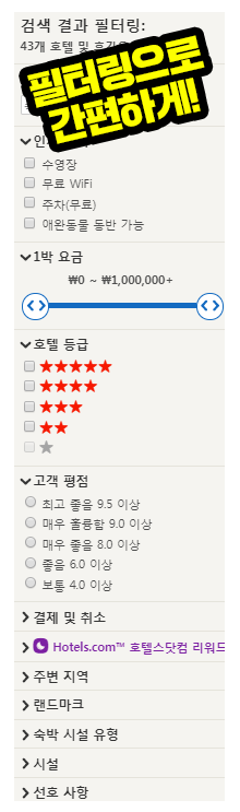 호텔스닷컴 사이트에는 필터링 기능이 있어서