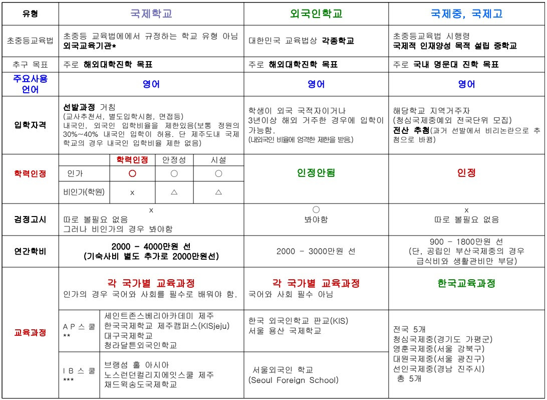 그리고 얘기를 듣다 보면 국제학교, 외국인학교, 국제중을 모두 국제학교라는 이름을 사용해 같은 개념으로생각하는 경우가 많다. 영어를 사용해 교육을 한다는 점이 비슷하지만 자세히 들여다보면 세가지 학교는 다른 유형의 학교다. 얼핏 학교 이름만 들어서는 어떤 학교인지 구분하기 어렵기 때문에 학교 이름을 검색하고그 유형을 보면 세 가지 유형중 하나의 학교에 속하는 걸 알 수 있다. (3가지 유형에 대한 비교는 아래 표로 정리해 놓았습니다.)