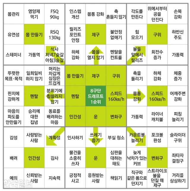 그리고 실제 고등학교 재학시절 목표달성을 위해 작성한 만다라트 계획표에도 쓰레기 줍기, 밥 몇 숟가락 먹기, 청소, 인사하기 등 남들이 보기에 다소 하찮은 일까지도 성공을 위한 핵심인자들로 분류하여 관리해왔습니다.