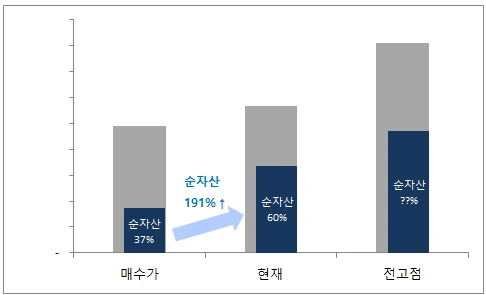 투자처의 현재 평균 실거래가는 전고점 대비 약 70% 수준이며, 전고점에 도달했을 때의 총자산은 부동산 매수시점 대비 166% 상승, 순자산 또한 레버리지를 줄여나갈 것이므로 증가할 것으로 예상합니다.