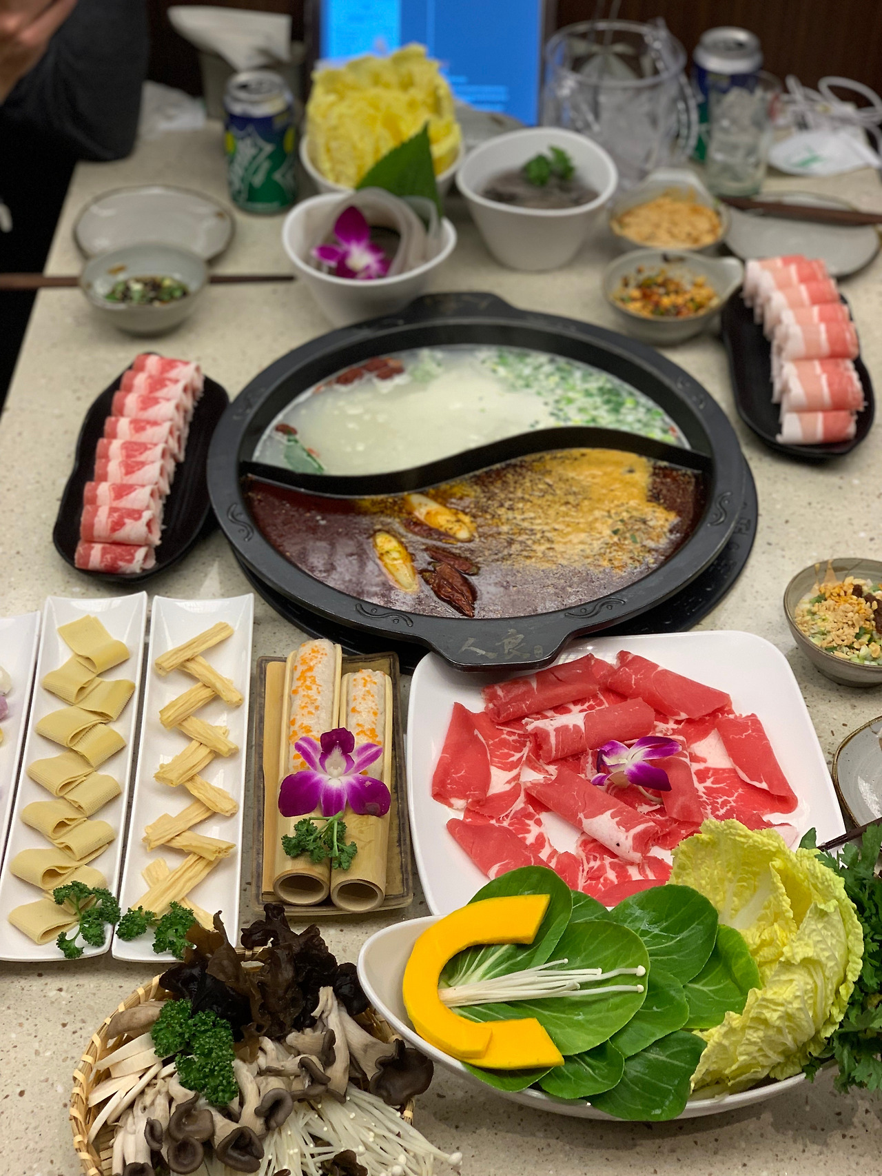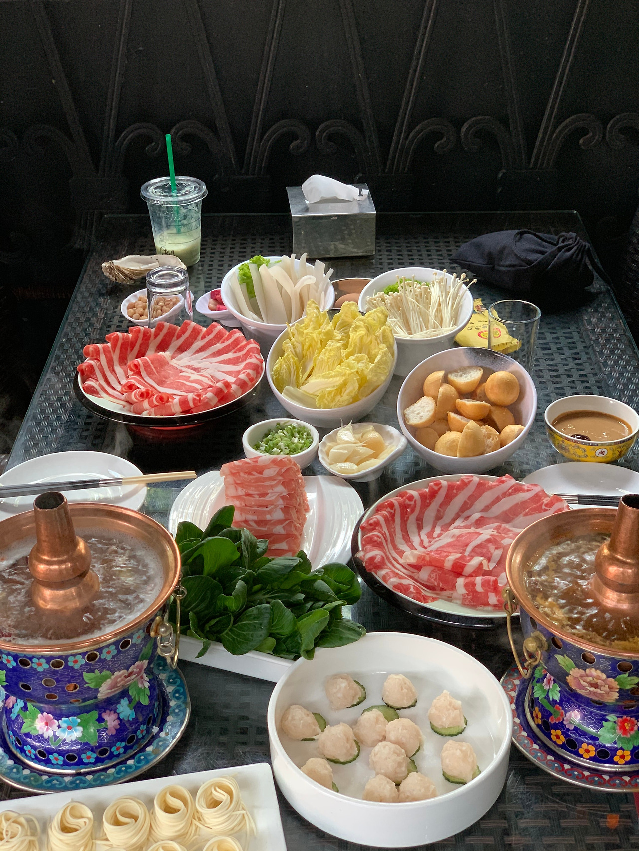 개인용 핫팟에 고기와 야채를 넣고 찍어먹는 훠궈, 훠궈를 맛있게 먹는 방법은 일단 해선장 소스에 고기와 버섯류를 소스통 안에 담가놓고 마장 소스로 야채와 완자, 중국 당면을 찍어 먹다가 그것을 다 먹으면 그다음 담가놓은 고기와 버섯류를 먹는다.