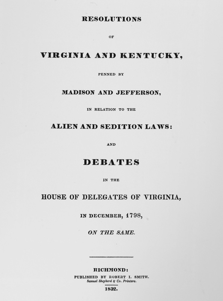 제퍼슨과 매디슨을 비롯한 민주공화주의자들은 이에 반발하여 선동법이 위헌이라고 주장합니다. 제퍼슨은 켄터키 주 의회 결의안을 작성하고, 매디슨은 버지니아 주 의회 결의안을 작성해, 두 주가 결의안을 채택합니다.