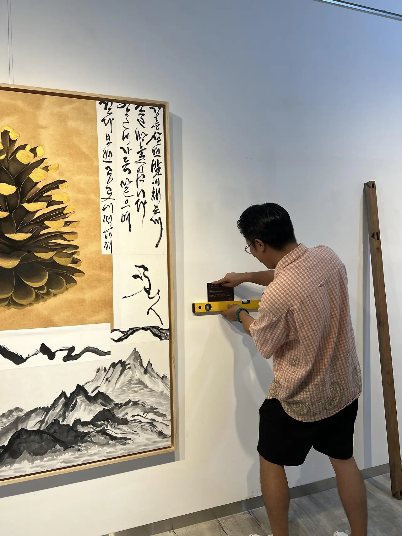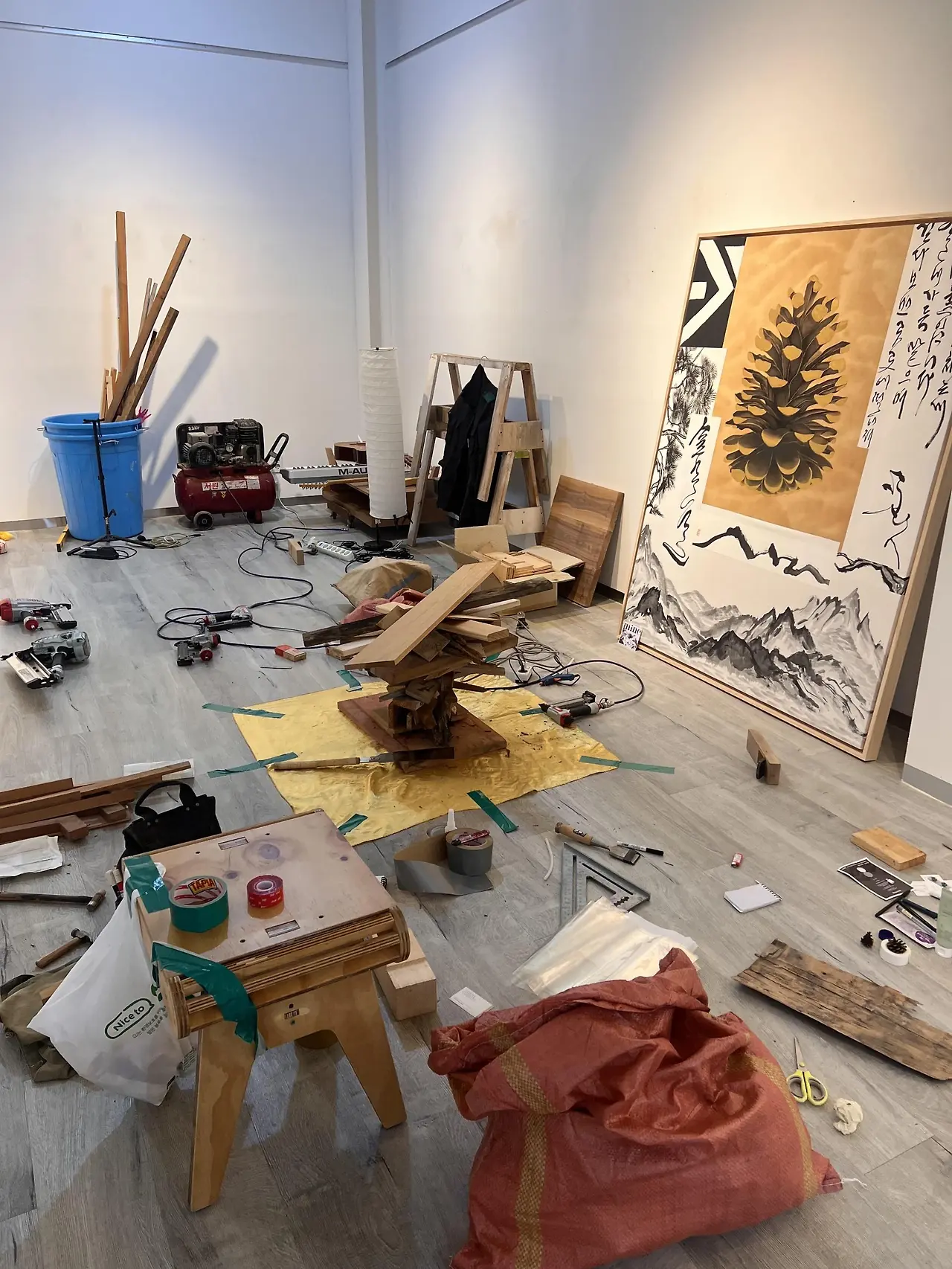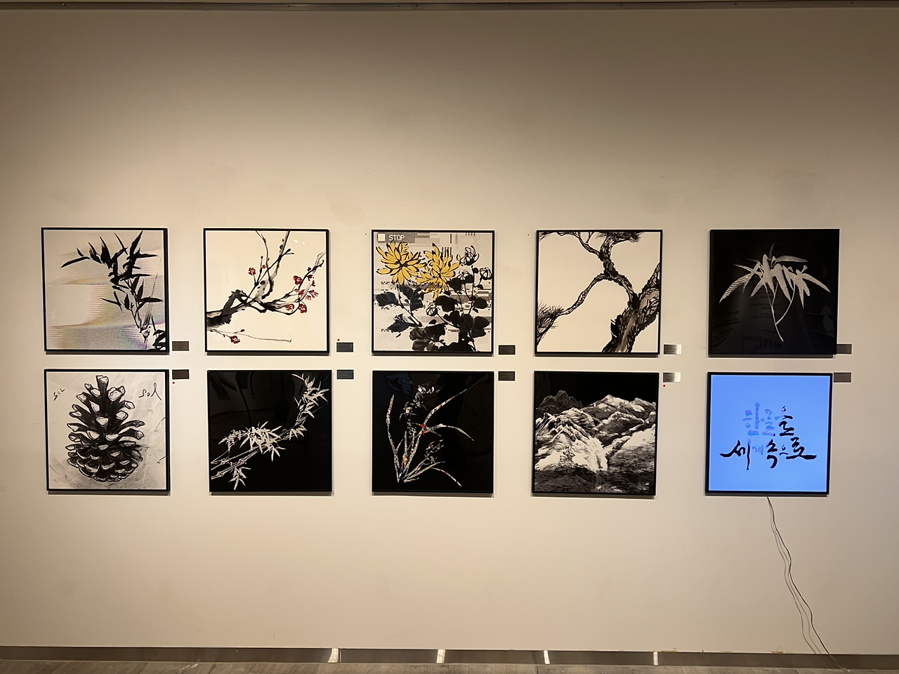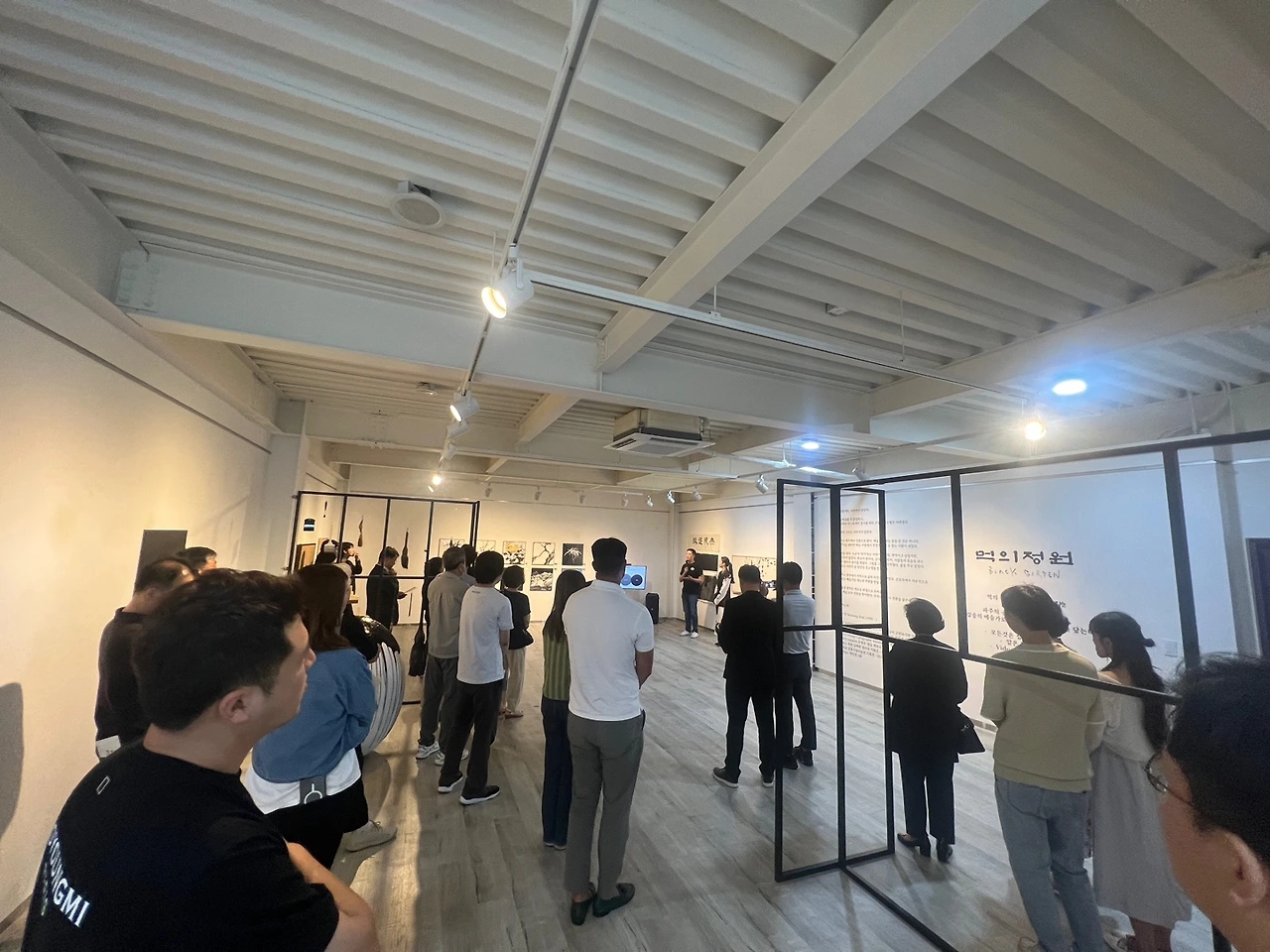3. 설치 : 모든 과정이 어렵지만 작품을 설치할 때는 특히나 계획대로 되지 않는다. 설계한 대로 디스플레이를 해보니 생각보다 작품의 배열이 마음에 들지 않아 순서가 바뀌기도 하고 너무 어긋나면 아예 빼버리게 되기도 한다. 특히나 <먹의 정원>은 디지털 패턴이나 이미지를 구현한 작품이 많았던 전시라 영상과 디바이스 연결하는 일, 와이파이 설정이나 브래킷을 연결해서 전시장 벽에 거치하는 사사로운 일부터 케이블 선을 정리하고 마무리하는 것 또한 주요한 과정이었다. 100호 이상의 액자를 걸 때 피스를 박아 걸어야 할 작품과 와이어 고리로 걸어야 할 작품을 구분하고 전시장에 맞는 고리를 찾아 구매해 거는 것은 장정 두 명이 붙어 수평을 맞춰가면서 작업해야 하는 정교한 일이었고. 조명 또한 강력한 도구인데 세팅하는 과정에서 디스플레이가 한 번 더 바뀌었다. 더구나 조형물까지 들어가는 상황이라 배치와 설치가 매우 까다로웠다. 목작업은 전시 이틀 전 현장에서 진행했는데 이 과정에서 모두가 한정된 시간과 자원에 힘들었다.