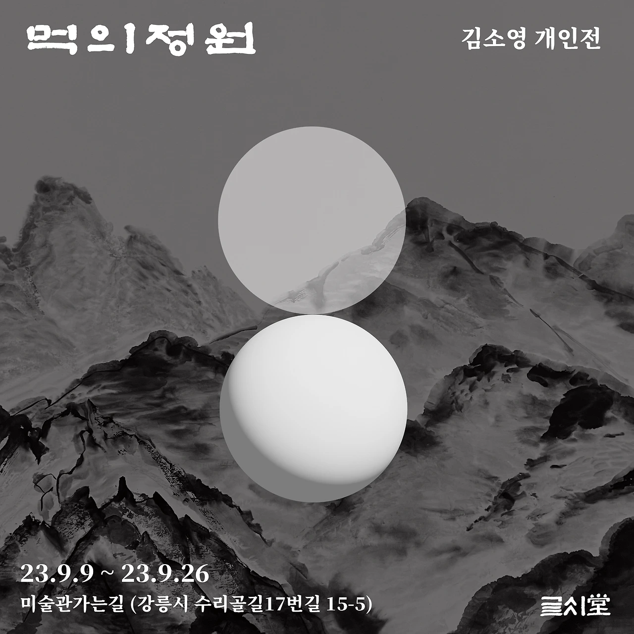 2. 디자인 : 써 놓은 글을 바탕으로 붓을 들어 제목을 썼다. ‘먹의 정원’의 기초가 되는 획과 글씨의 이미지를 바탕 삼아 전체적인 비주얼과 이미지를 붓획의 느낌과 함께 흑백으로 구현했다. 중심을 차지하는 큰 정원의 표현으로 마주하는 모습의 전환, 끊임없이 반복되는 순환을 표현했다. 그렇게 포스터가 되었고, 리플릿이 되었고, 현수막이 되었다. 어느 정도 계획이 구체화되어가는 것을 디자인 과정에서 뾰족하게 느꼈다. 사이즈 맞춰 인쇄를 맡기고 출력해서 포스터를 붙이고 관람객의 입장에서 동선을 짜고, 층별로 안내 리플릿과 엽서도 함께 제작했다. 1층부터 3층까지 파트를 나누어 관람객의 관점에서 경험을 디자인했다. 더불어 작품의 느낌에 따라 순서를 조금씩 바꾸기도 했다. 캡션을 흑색 금속으로 새겨 만들고, 액자의 틀을 원목으로 하는 등 전체적인 분위기와 구성에 맞는 <먹의 정원>의 결을 맞추는 것도 이 과정의 목표였다.