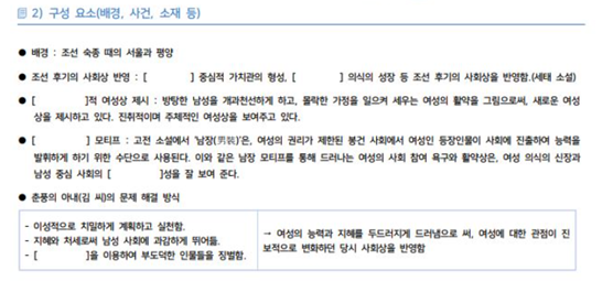 진취적 여성으로 남장모티브가 등장한다고 정리하고 있으나 가부장적 남성의 포악한 행동과 사회의 묵인, 그리고 유난히 남성에게 관용적인 문화에 대한 반성은 찾아볼 수가 없다. 여러 문제집이나 교과서 활동에서도 보이지 않는다.