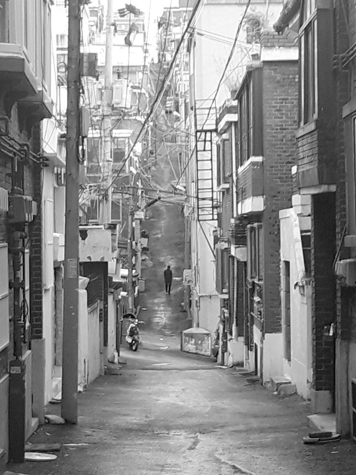 집이 다닥다닥 붙어있는 성남시 태평동의 골목길에서 착안한 건반의 거리, 골목의 끝에서 사람이 보인다. 사람이 살고 있는 하늘과 맞닿은 동네의 모습을 표현하고 있다.