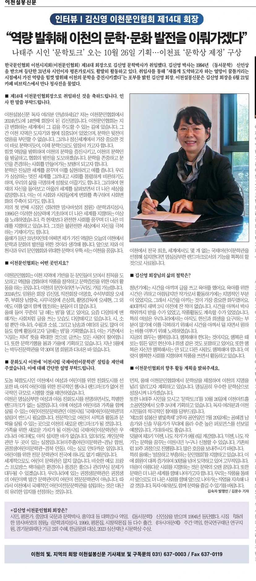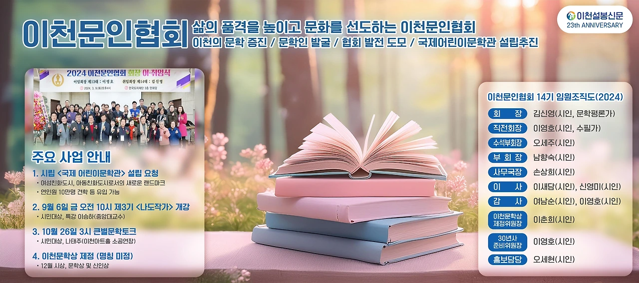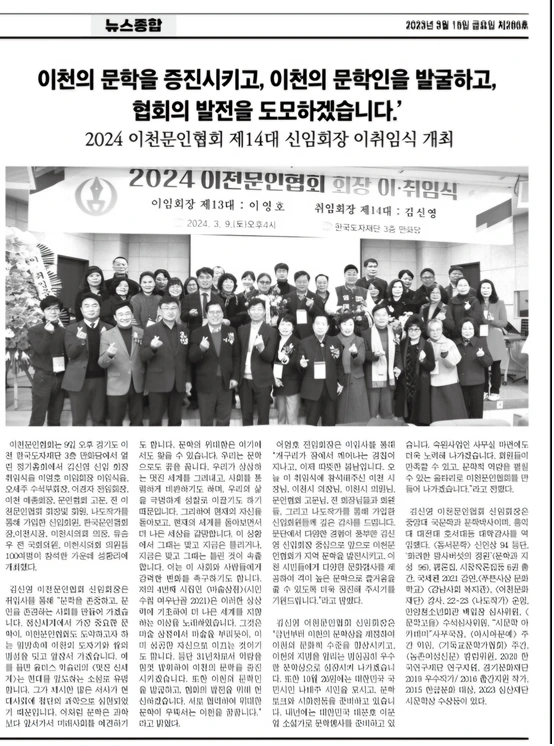 도시의 번잡함을 벗어버리고 이천에서 산다는 것은 또 이천에서 매끼 쌀밥에 나물 얹어 먹는 일이기도 하다. 손님이 올 때마다 이천 쌀밥을 대접한다. 이천은 쌀밥집도 부지기수라 어디로든 발 닿는 데로 간다. 이천에서 기반을 잡고 작가를 양성하는 일에 주력하면서 이천문화재단 강사로 활동하고 있다. 또한 올해 2024년 1월에 이천문인협회 회장이 되었다. 생업인 학원도 이곳에서 기반을 잡고 있다.