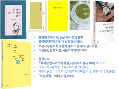 어찌 되었든 대학강사로는 생업이 해결되지 않았기에 가르치는 게 특기인 나는 얼마 되지 않아서 학원업을 시작했다. 작게 집에서 공부방을 하다가 조금씩 키워서 50여 평의 학원으로 발전하였다. 지금은 그것도 그만두고 다른 인생을 설계하고 있다. 새로운 길에 있으며 새로운 길을 가고자 한다. <마술 상점>(2021)은 그런 전환의 지점에서 탄생하였다. 나만을 위한 삶이 아니라 타인을 위한 점등인이 되기로 결심한 것이다. 그리하여 사람들에게 마술 같은 일이 넘쳐나기를 소망하였다. 그 시집으로 받은 상이 심산재단의 시문학상(2023)이다.