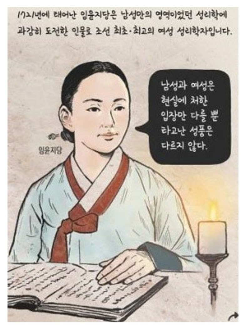 사임당에 버금가는 임윤지당은 조선시대 최초의 여성 성리학자이자 평등주의자다. 그는 수양과 실천을 통해 성인을 지향하였다. 그의 성리학 문집인 『윤지당유고』(1796, 정조 20)에서 역사의 인물에 대한 평가와 성차별을 하지 말라는 평등론, 그리고 성리학의 이상인 성인론까지 철학이 정리되어 있다.