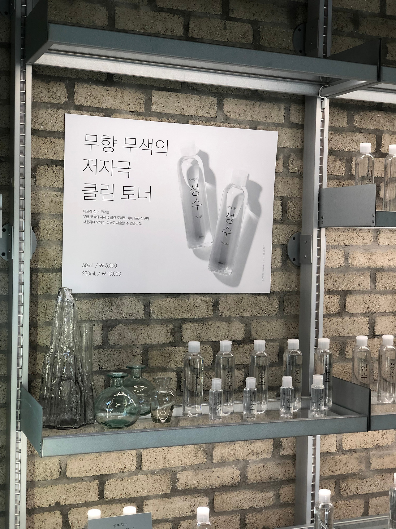 브랜드 플래그십 스토어에서 빠질 수 없는 것이 또 '굿즈'이다. 해당 공간에서만 판매하는 '굿즈'는 브랜드 로열티를 높여주고 플래그십 스토어의 기념성을 더해줄 뿐만 아니라 공간을 방문할 동기도 마련해준다. '아모레성수'의 굿즈는 바로 '성수토너'로 해당 공간 내 '성수마켓'에서 구매할 수 있다. 무향 무색의 저자극 토너로 무해한 성분만을 사용하여 연약한 피부도 사용할 수 있는 제품이라고 한다. 성수마켓에서는 또한 앱 체크인을 하면 샘플을 직접 골라 담아 가져 갈 수 있는 쿠폰을 제공한다. 직접 원하는 샘플을 담아갈 수 있어 재미를 높인 점이 인상 깊다.