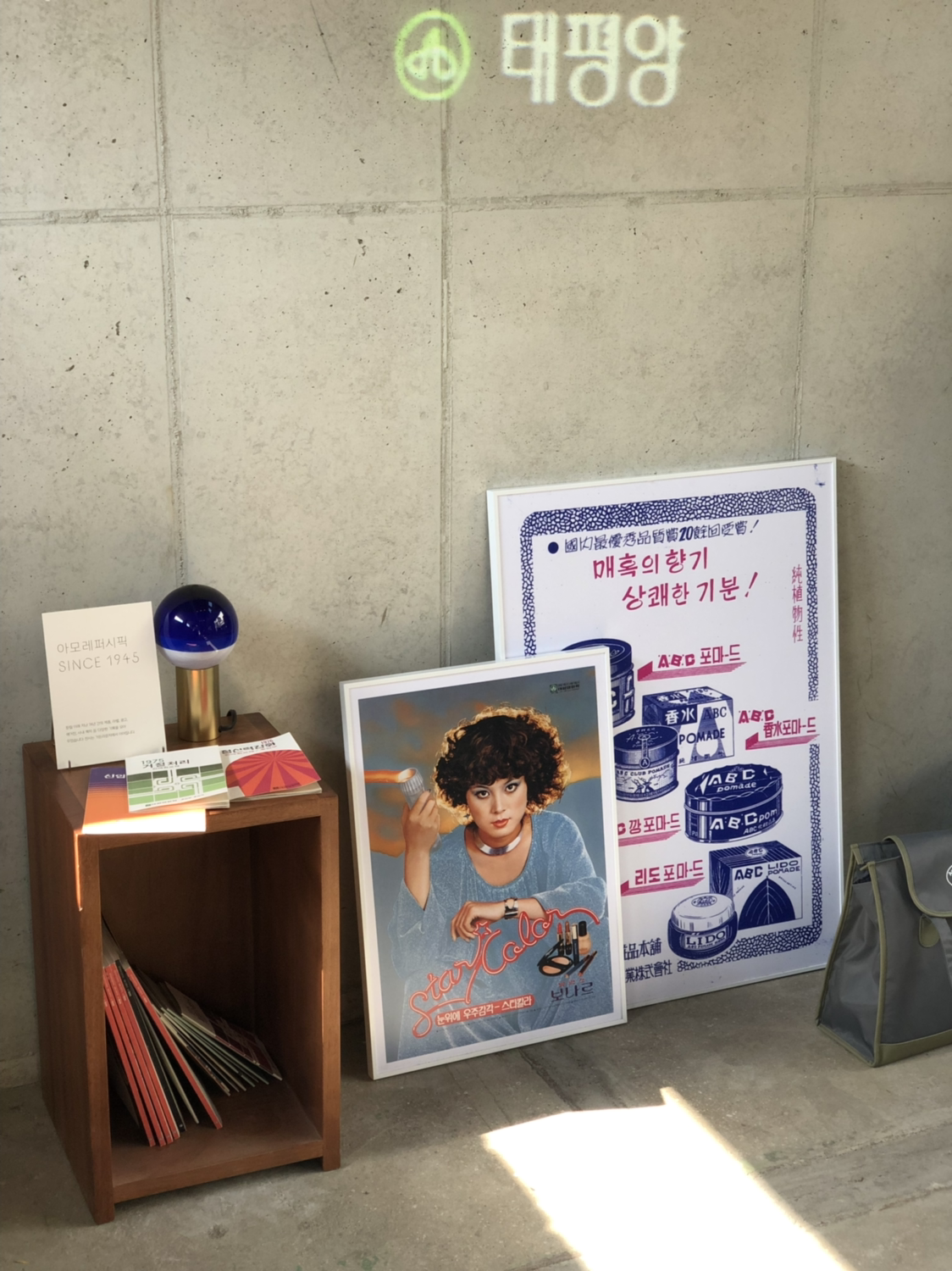 지금의 핫한 '성수'가 되기까지 주요한 역할을 한 것은 바로 기존의 버려진 공간을 활용하여 새롭게 탄생한 수많은 핫플레이스 덕분이다. 정미소의 건물과 뼈대를 살려 카페로 개조한 '대림창고', 폐공장을 활용하여 카페로 바꾼 '어니언', 화학공장 부지를 재활용한 복합 문화공간 '성수연방'까지. 이렇게 옛 건물을 그대로 살려 만든 공간에는 '뉴트로-새로움(New)과 복고(Retro)-' 감성이 그대로 살아있다. 아모레 성수도 이러한 감성에 맞추어 '오래된 자동차 정비소'를 개조하여 만들었다. 여기에 곳곳에 아모레퍼시픽의 예전 이름인 '태평양'의 추억을 가득 담은 포스터와 방문판매 시절 판매했던 제품을 놓아 뉴트로 감성이 한껏 느껴지게 했다.