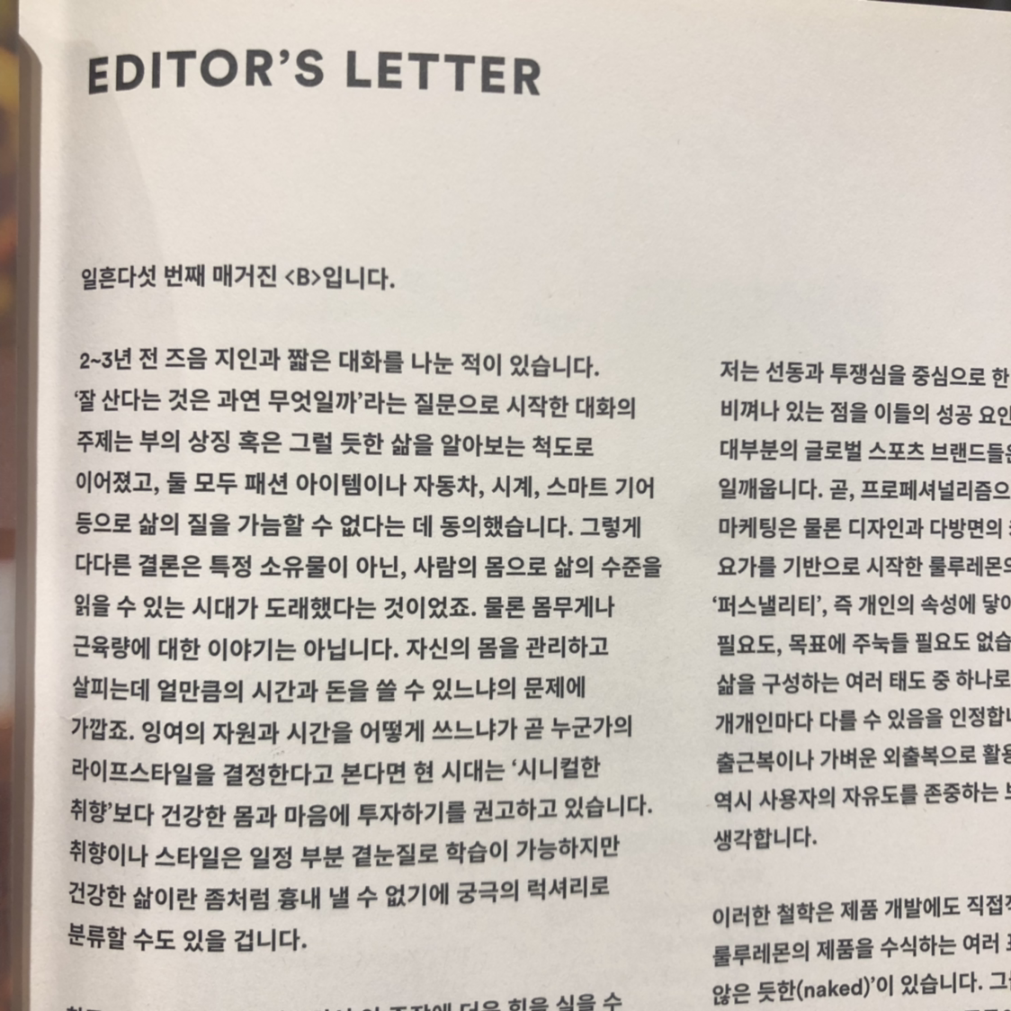 룰루레몬이라는 브랜드에 대해 알아보고 싶게 만들었던 것은 순전히 매거진 <B>의 편집장의 글의 첫 번째 줄 덕분이었다.