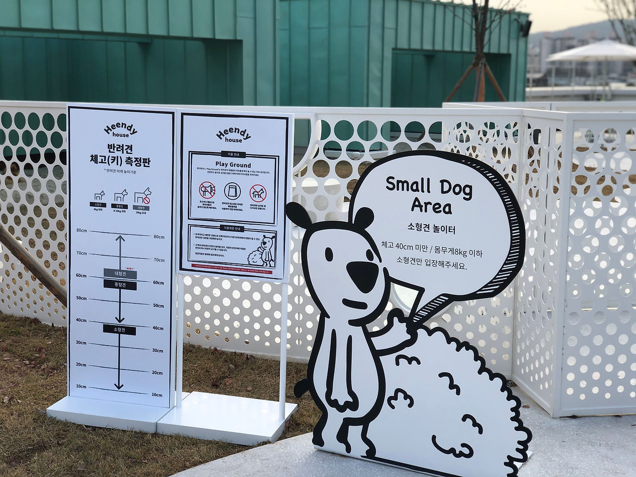 사실 처음에는 흰디를 활용한 굿즈를 판매하는 곳인 줄 알았으나 댕댕이 흰디를 잘 활용해서 친근감을 높인 멋진 공간이었다. 각 놀이터 별로 강아지 체격에 따라 입장할 수 있는 기준을 둬서 세심하게 관리하고 있었다. 뿐만 아니라 1층에는 각종 강아지 간식과 의류들을 판매하고, 강아지 그림을 그려주는 공간도 있어서 댕댕이와 함께 하고 싶은 마음을 잘 반영해 준 공간이라고 생각한다.