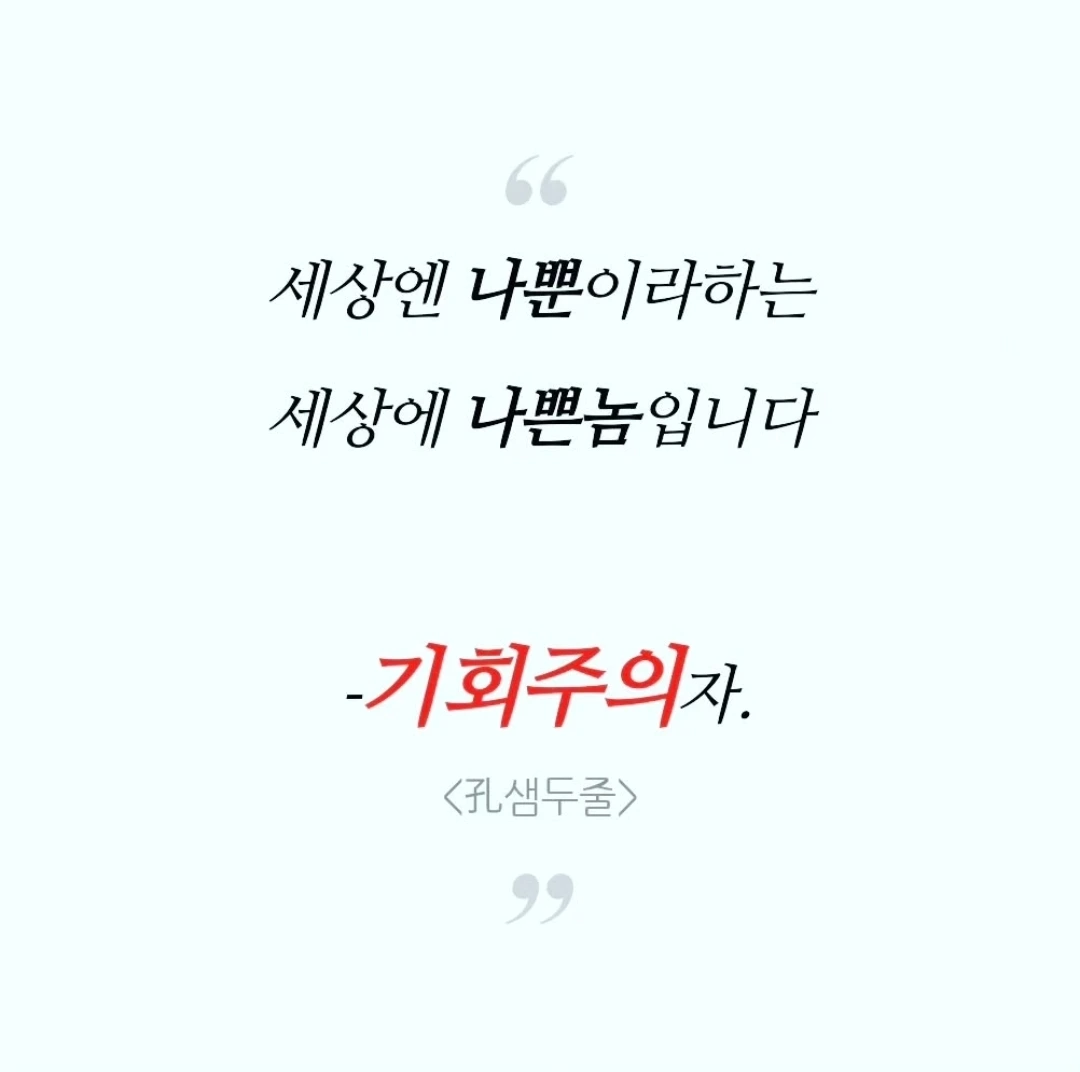 이런 기회주의자들에게 기회를 주는 사람들은 바보입니다. 멍청이입니다. 개돼지 취급 받으면서도 자신만이라도 조금 나은 여물을 먹기 위해 저런 기회주의자들을 용납해서는 평생 개돼지를 벗어날 수 없습니다. 똑같이 나쁜 놈이 되는 겁니다.