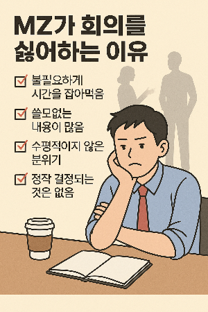 반면 MZ에게 회의는 살짝 다른 얼굴을 하고 있다. 그들에게 회의는 종종 “시간을 잡아먹는 의식”처럼 보인다.