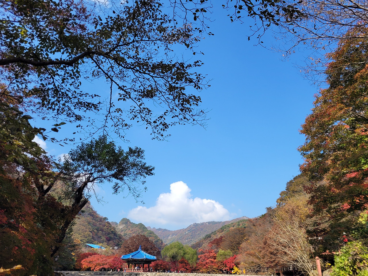 내장산을 오는 것이 망설여졌던 이유는 수도권에서 오기에 소요시간이 길다는 것 이외에도 단풍철 교통지옥이 펼쳐질 것이 예상되었기 때문이었다. 고심 끝에 숙소를 매표소 바로 코 앞에 예약했다. 이른 아침 내장산 개장 시간에 맞춰 붐비는 시간을 피하기로 계획한 것은 신의 한 수였다. 개장하기 전부터 입구는 등산객들로 인산인해를 이루었다. 설악산에 갔던 동료가 설악산 입구에서 되돌아왔다는 전설 아닌 전설은 허언이 아니었다. 우리는 내장산 입구까지 걸어서 1분 컷인 덕분에 편안하게 단풍을 즐길 수 있었다.