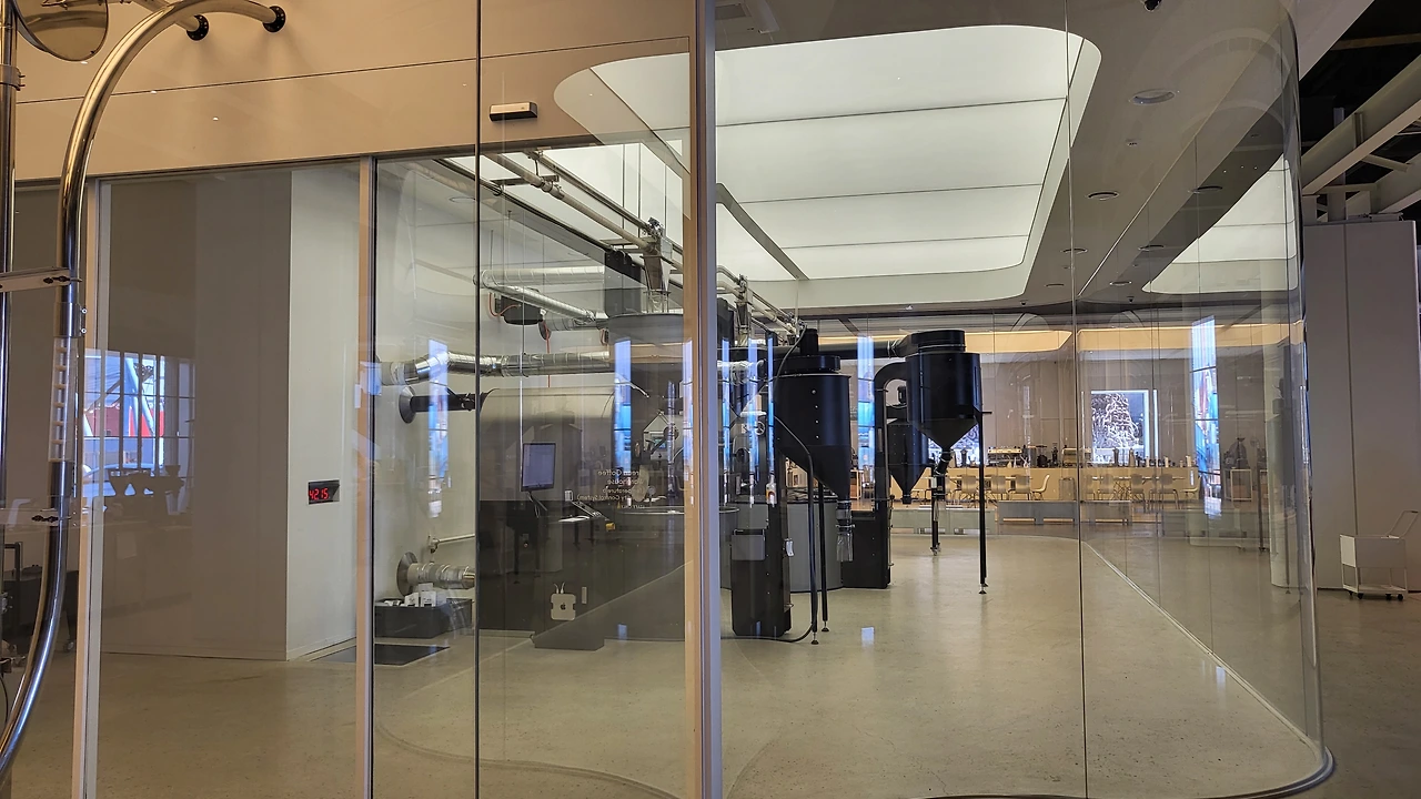 영도 모모스 커피 로스터리 앤 커피바는 'All About Coffee'라고 표현될 만큼 커피 체험에 특화되어 있는 공간이었습니다. 선박수리공장이 보이는 바닷가 앞에 위치한 정문을 열면 마치 호텔 컨시어지 서비스를 받는 것처럼 본인인증과 웨이팅 등록을 합니다. 차례가 올 때까지 공간을 둘러보면 다양한 산지의 커피 생두를 포대 째로 보관한 창고부터 사일로(원통형 저장소), 로스팅 기계, 드립백 패키징 기계까지 마치 커피공장 및 연구소에 들어온 느낌을 줍니다.