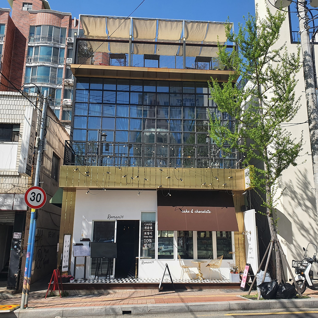 오늘은 그 빈티지 38에서 몇 발자국 거리에 있는 로망 34라는 카페로 떠나보려고 합니다. 우선 아래 사진의 카페 외관을 보면 무언가 아기자기한 단독 주택 같은 느낌이 있습니다. 빈티지 사단이라고 불리는 부산 전포동의 문정호 대표님이 운영하는 F&B 공간들은 각각 개성이 뚜렷한 걸로 유명한데요. 설레는 마음을 안은 채 내부로 들어가 보면 샤랄라 한 디자인의 인테리어와 시그니처 케이크, 초콜릿이 방문객을 맞이합니다.