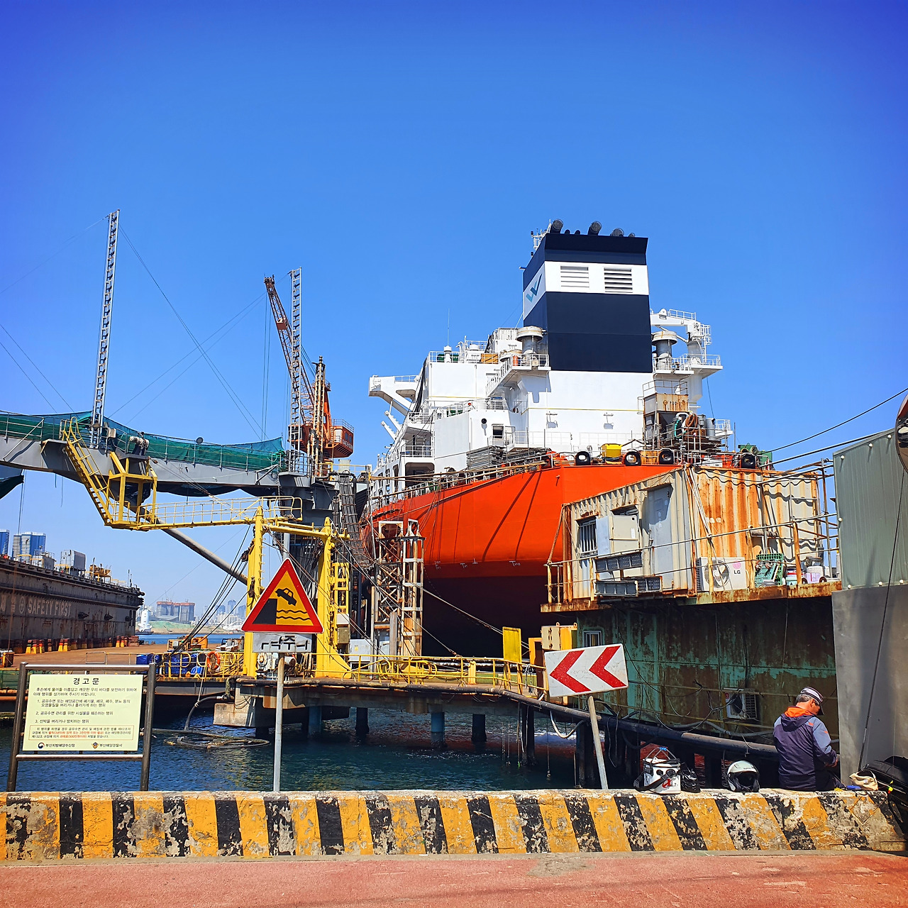 음료를 주문하면 1층에 있는 넓은 테이블에 앉아서, 로컬 매거진을 보며 시간을 보내기도 좋고 아니면 2층으로 올라가서 눈앞에 펼쳐지는 영도 바닷가의 조선소 풍경을 바라보는 것도 꽤나 운치 있습니다. 무언가 부산의 진면목을 바라볼 수 있다고나 할까요(사실 멍 때리기 좋습니다)