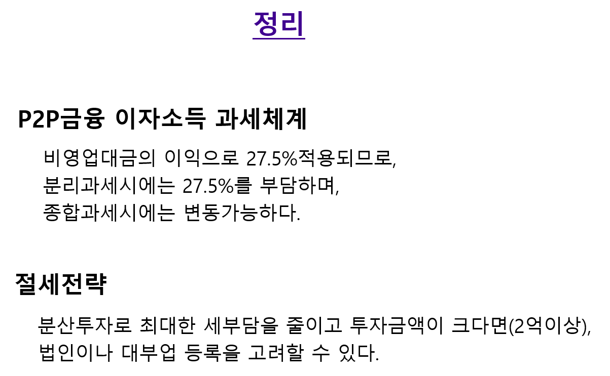 2. 절세전략에서는 분산투자로 최대한 세부담을 줄이고 투자금액이 2억을 초과할 정도로 크다면, 법인이나 대부업 등록을 고려해볼 수 있다는 것입니다.