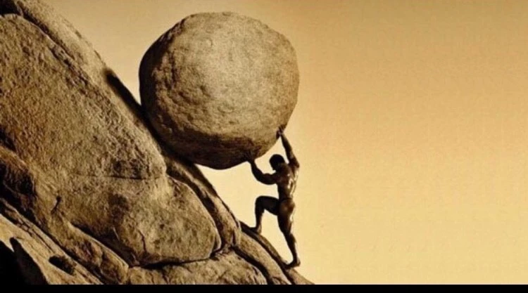 시지프스는 다시 세상을 떠난 뒤 신들을 기만한 죄로 산 정상으로 바위를 밀어 올리는 벌을 받게 된다. 바위는 정상에 오면 다시 아래로 굴러 떨어지기 때문에 처음부터 다시 올려야 하는 영원한 노동이다. 바로 이 무의미함이 인간의 삶과 똑같다. 매일 먹고 싸고 자고 먹고 싸고 자고 그저 그뿐이다.
