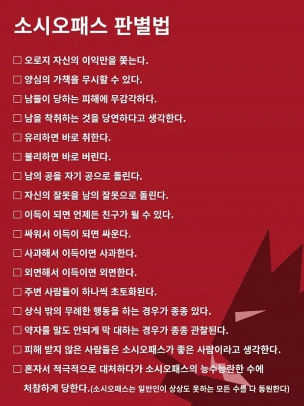 ● 자신의 성공을 위해 타인을 이용하고 거짓말을 일삼지만, 양심의 가책을 느끼지 않는다.